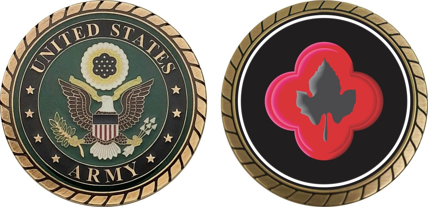 This 1 3/4” 43rd Infantry Brigade Patch Challenge Coin is proudly offered by Militarybest. This Officially Licensed Army coin has beautiful enamel finish on one side and an organized crisp clean design on the opposite side.