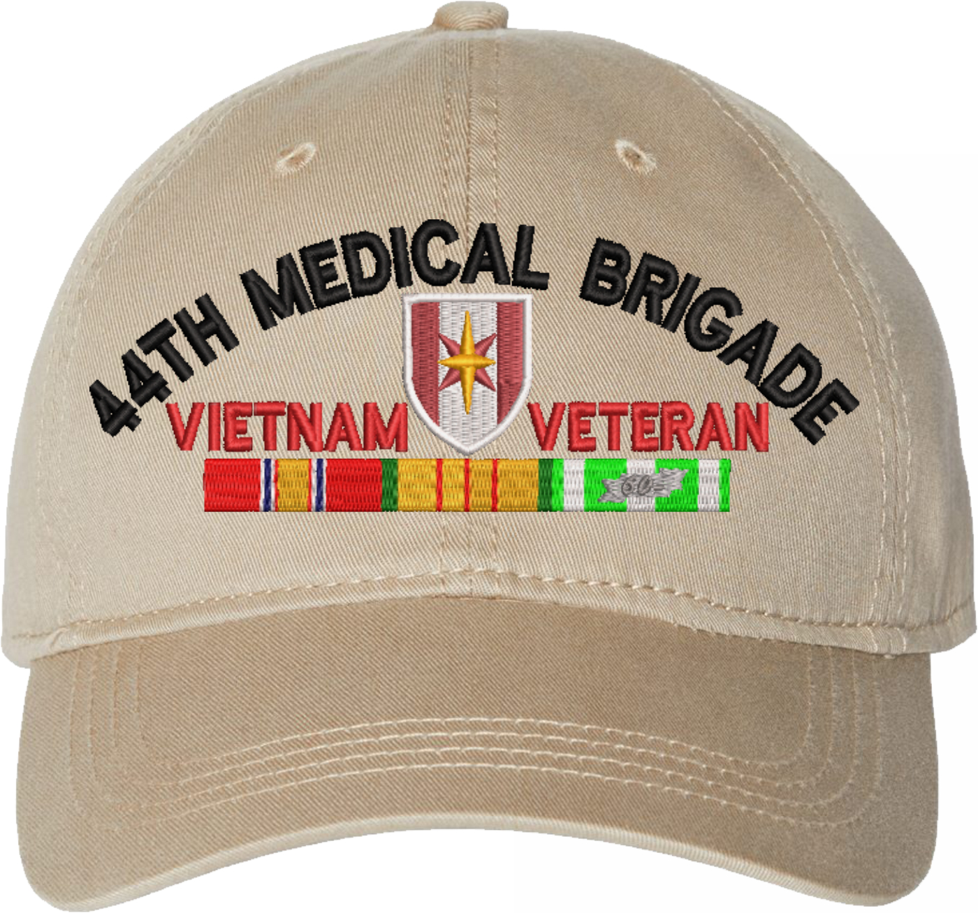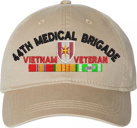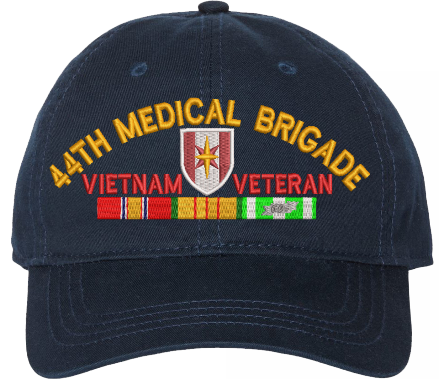 Show your Army pride with this 44th Medical Brigade Vietnam Veteran with Ribbons Unstructured Dad Cap from MilitaryBest. Crafted from 100% washed chino twill cotton, this six-panel, low-profile cap offers a relaxed and comfortable fit. Featuring high-quality embroidery done in our Scottsboro, Alabama facility, this cap is designed with a pre-curved visor and an adjustable tri-glide buckle closure for a perfect fit. Whether for everyday wear or as a meaningful gift, this cap is a great way to honor your own or a loved one's service.For caps ordered with custom embroidered personalized text please allow an additional 3 to 5 days production time. All custom back text will be embroidered in ALL CAPITAL LETTERS. Caps with back text or eggs are non-returnable unless there is a material defect in the cap.
