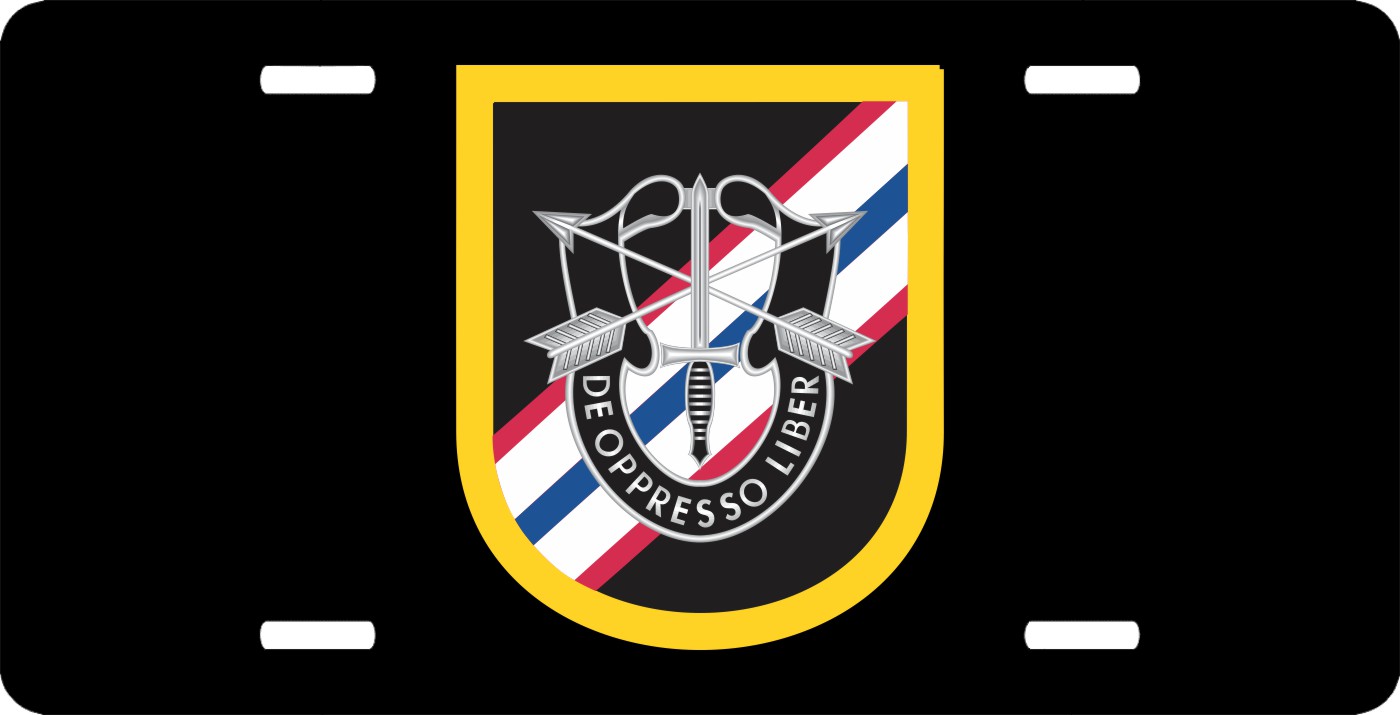 This 46th Special Forces Company Flash License Plate is made from heavy gauge aluminum and has a baked enamel finish to last for many years of use. Each plate measures 5 15/16" x 11 15/16". This license plate would make a wonderful addition to your collection or a great gift.