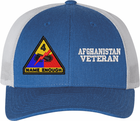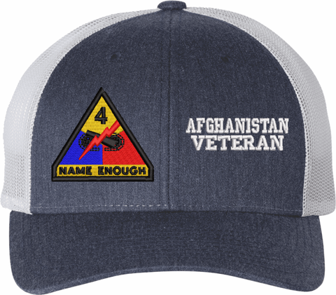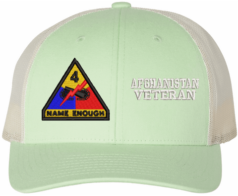 MilitaryBest is proud to offer this Mesh Back U.S. Army 4th Armored Division Afghanistan Veteran Women's Split-Cap. The design is embroidered onto a 6x panel mid/low profile mesh back cap and is crisp, clean, and sure to be loved by all! As with all MilitaryBest caps and apparel your satisfaction is guaranteed!Caps ordered with embroidered back text requires an additional 1 to 2 days of production time. All personalized caps will be embroidered in ALL CAPITAL LETTERS. Caps personalized with back text are not returnable unless there is a material defect in the cap.