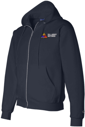 MilitaryBest is proud to offer this quality 4th Armored Division Retired Zippered Hoodie. Each U.S. Army Zippered Hoodie is direct embroidered onto either a Champion or Gildan brand Zippered Hoodie using a 9.5 oz 50/50 Cotton Poly blend material. These Military Zippered Hoodies are proudly embroidered at our facilities in Scottsboro, AL.