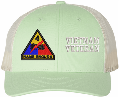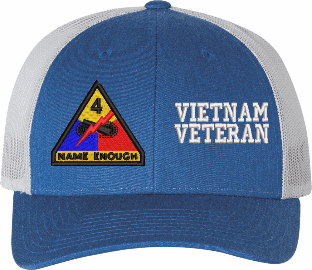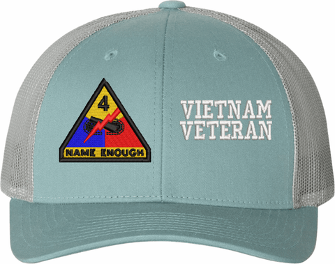 MilitaryBest is proud to offer this Mesh Back U.S. Army 4th Armored Division Vietnam Veteran Women's Split-Cap. The design is embroidered onto a 6x panel mid/low profile mesh back cap and is crisp, clean, and sure to be loved by all! As with all MilitaryBest caps and apparel your satisfaction is guaranteed!Caps ordered with embroidered back text requires an additional 1 to 2 days of production time. All personalized caps will be embroidered in ALL CAPITAL LETTERS. Caps personalized with back text are not returnable unless there is a material defect in the cap.