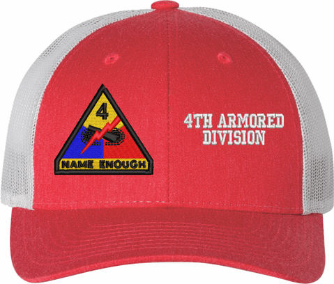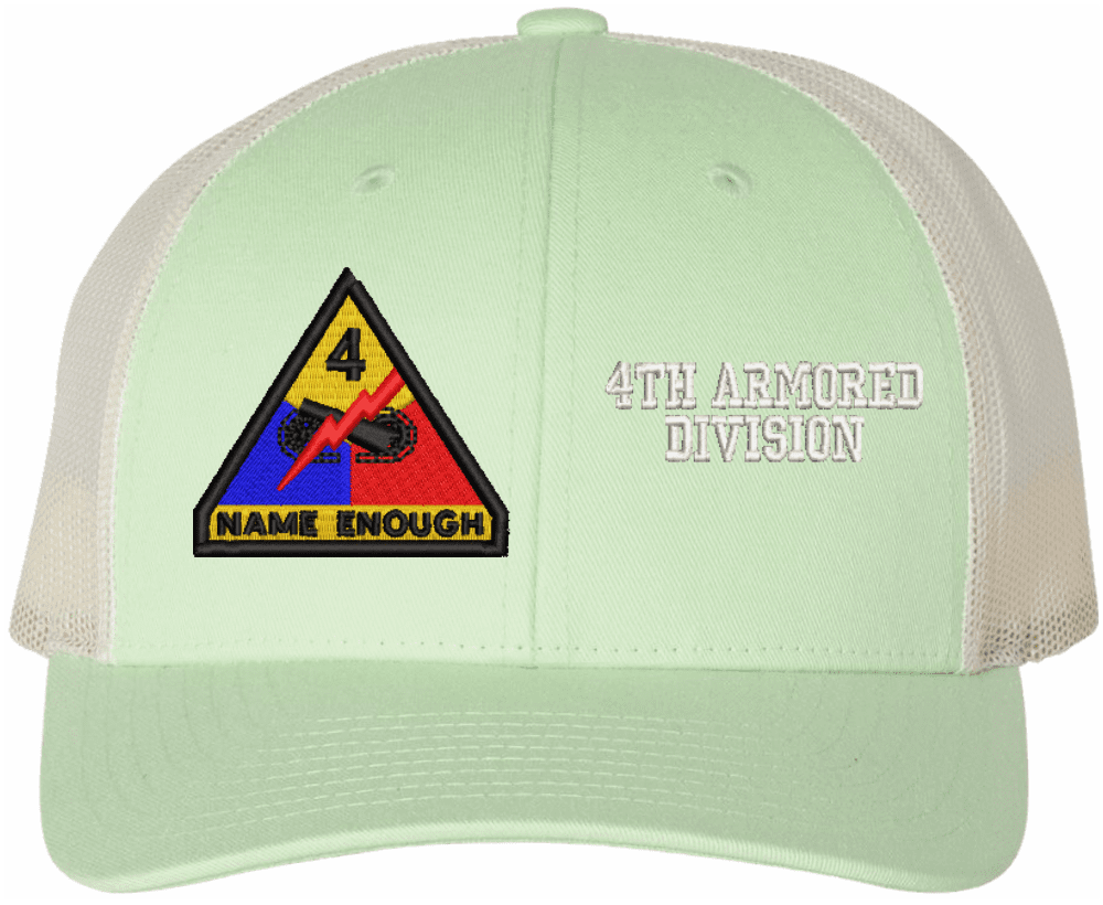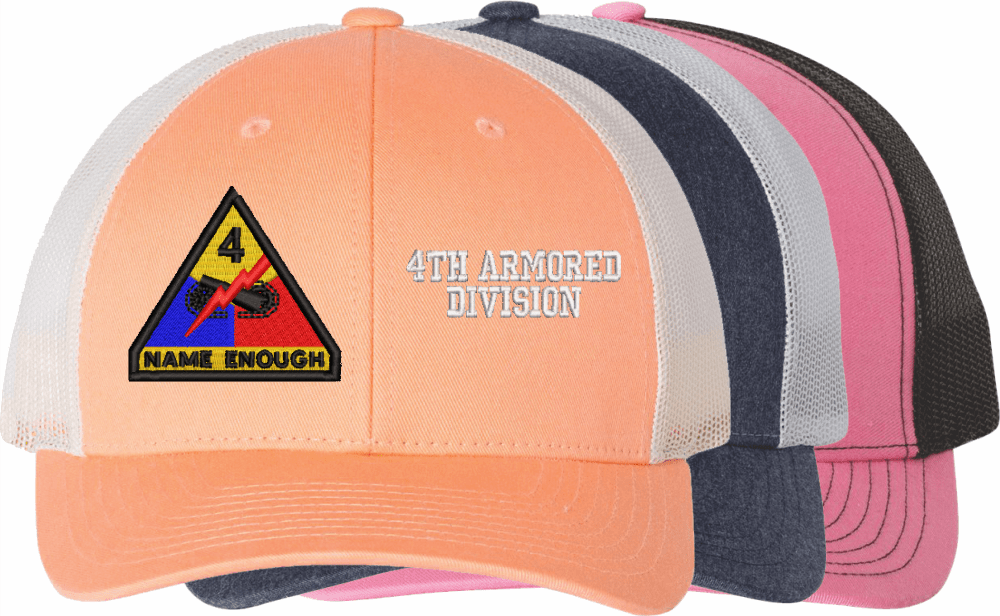 MilitaryBest is proud to offer this Mesh Back U.S. Army 4th Armored Division Women's Split-Cap. The design is embroidered onto a 6x panel mid/low profile mesh back cap and is crisp, clean, and sure to be loved by all! As with all MilitaryBest caps and apparel your satisfaction is guaranteed!Caps ordered with embroidered back text requires an additional 1 to 2 days of production time. All personalized caps will be embroidered in ALL CAPITAL LETTERS. Caps personalized with back text are not returnable unless there is a material defect in the cap.