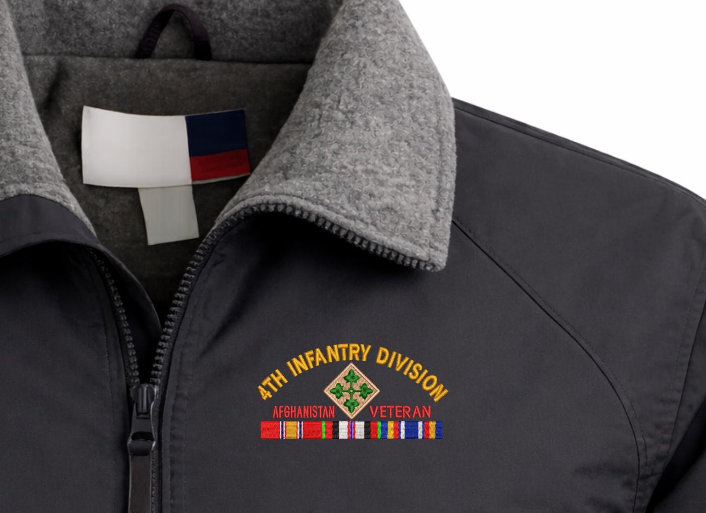 Note: Some of the Color Options pictured may not be available. Available Color Options are listed on the drop down menu above.MilitaryBest is proud to offer this quality U.S. Army 4th Infantry Division Afghanistan Veteran with Ribbons Embroidered 3-Season Jacket. This 3-Season Jacket is made from a 3-Layer system consisting of a nylon shell, an insulator layer, Nylon-lined sleeves, and an inside layer of fleece for comfort. The jacket features include a sturdy black enamel front-zipper, raglan sleeves, outsize zip pockets, an inside zip security pocket, YKK zippers, and a banded-bottom. This Jacket will make an excellent addition to your wardrobe, or a quality gift. Your satisfaction is guaranteed! Depending on your location this jacket can be worn in fall, winter, and spring. These quality Military Jackets are proudly embroidered at our facilities in Scottsboro, AL. Support the Army MWR program by purchasing only from Licensed Vendors.