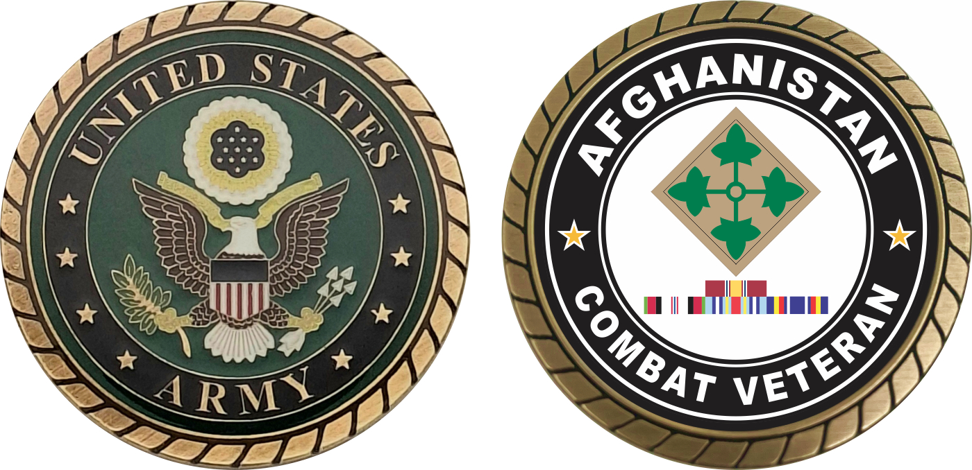 This 1 3/4” 4th Infantry Division Afghanistan with GWOT Ribbons Combat Veteran Challenge Coin is proudly offered by MilitaryBest. This Officially Licensed Army coin has beautiful enamel finish on one side and an organized crisp clean 4th Infantry Division Afghanistan with GWOT Ribbons Combat Veteran design on the opposite side.