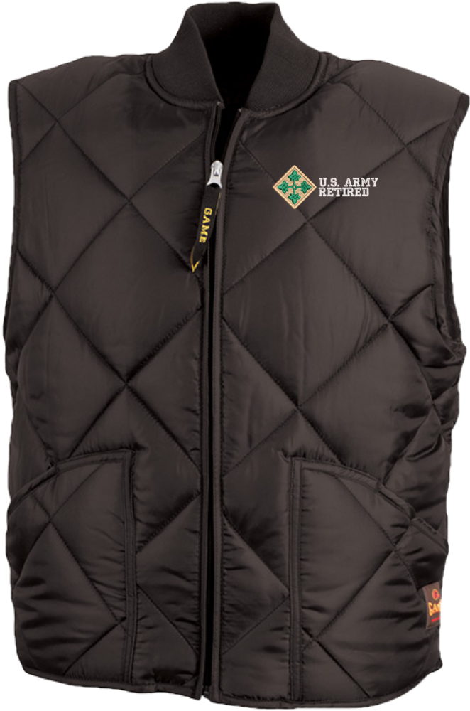 MilitaryBest is proud to offer this quality 4th Infantry Division Retired Game Sportswear Finest Vest. Our U.S. Army Vests feature, wind-resistant nylon taffeta shell, 5oz poly-fill lining with thermal knit backing, full front zipper, 2 outer pockets, and are machine washable. These Military Sportswear Vests are proudly embroidered at our facilities in Scottsboro, AL.