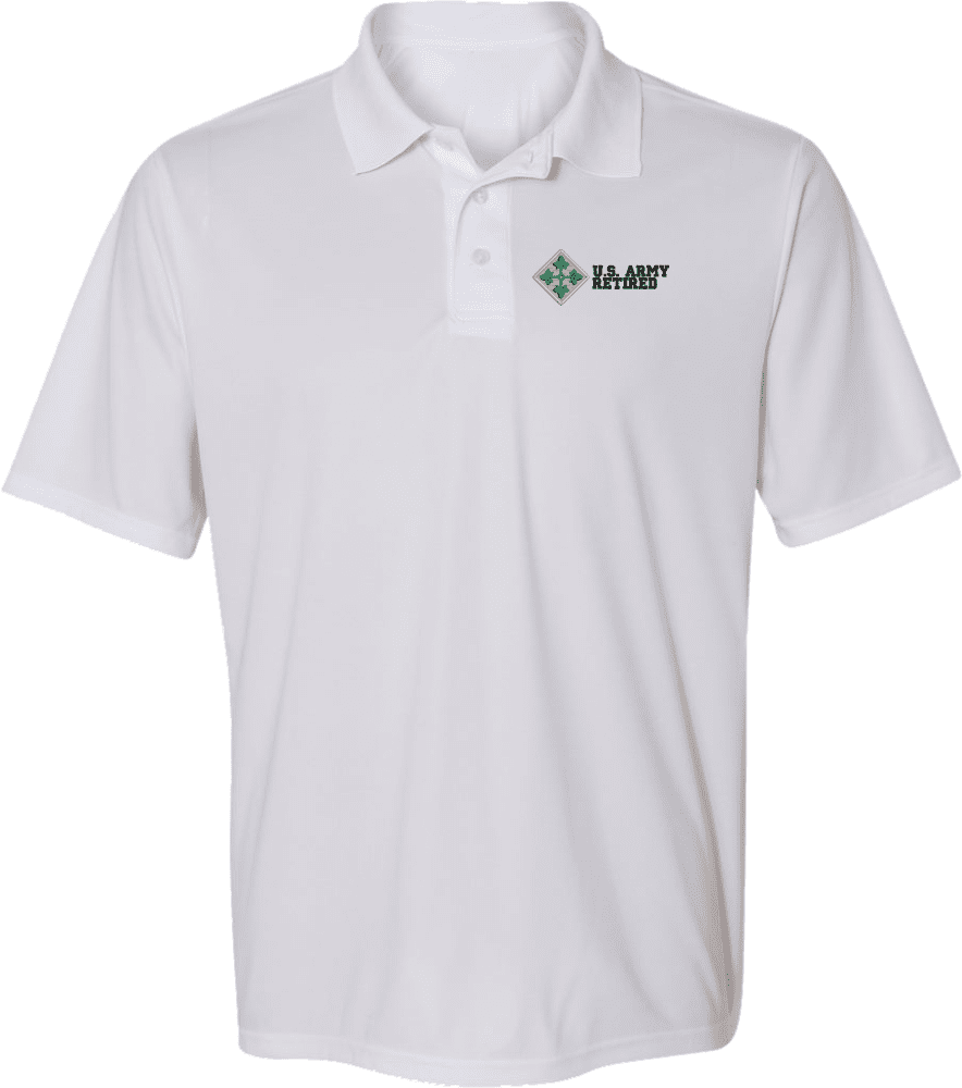 MilitaryBest is proud to offer this quality 4th Infantry Division Retired Polo. This Polo is made using 50/50 cotton/polyester moisture wicking material.These quality Military Polos are proudly embroidered at our facilities in Scottsboro, AL. Support the Army MWR program by purchasing only from Licensed Vendors.