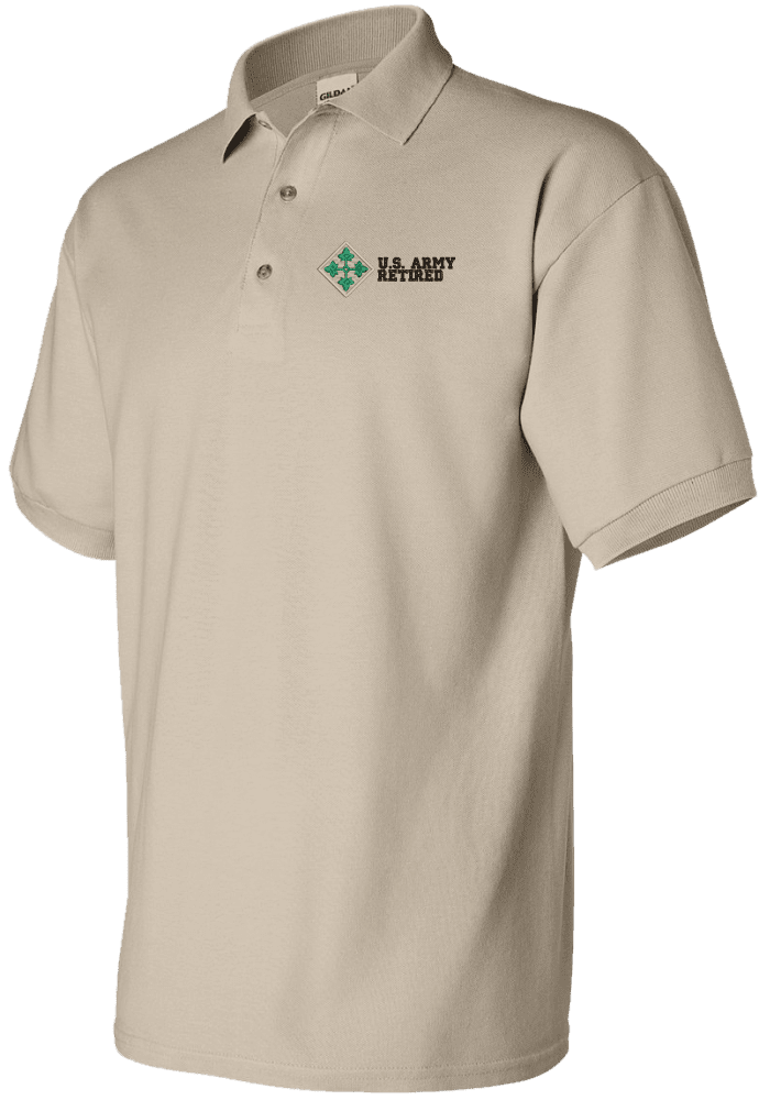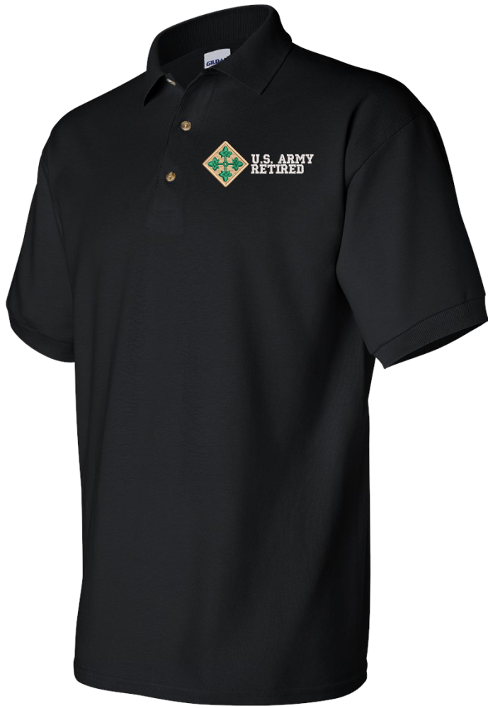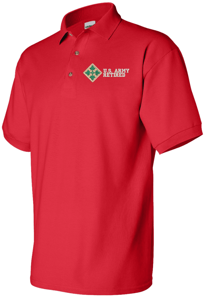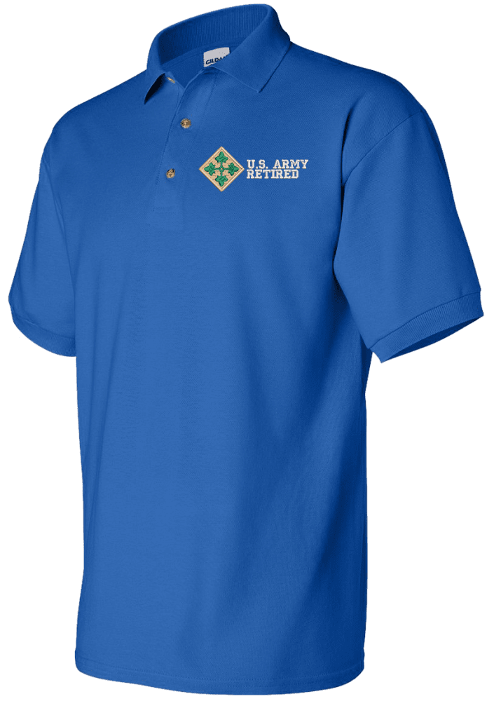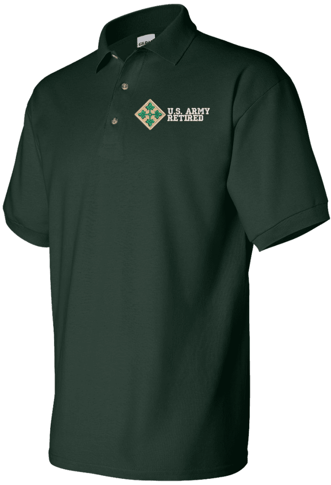 Note: Some of the Color Options pictured may not be available. Available Color Options are listed on the drop down menu above.MilitaryBest is proud to offer this quality 4th Infantry Division Retired Polo. Each Polo is available in either 100% Ringspun cotton pique or a 50/50 cotton/polyester blend. These quality Military Polos are proudly embroidered at our facilities in Scottsboro, AL. Support the Army MWR program by purchasing only from Licensed Vendors.