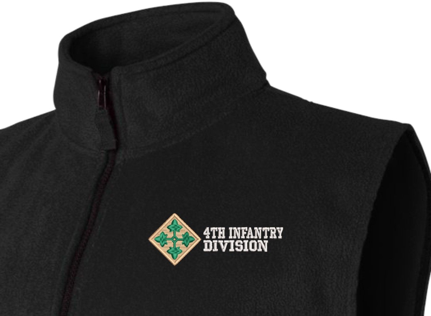 Due to supply chain disruptions, some colors and sizes may not be available in the same Brand, in these cases a brand of comparable quality will be used. Feel free to call in advance of your order, with questions you may have.MilitaryBest is proud to offer this quality 4th Infantry Division Full-Zip Fleece Vest. Our U.S. Army Full Zip Fleece Vest features a convertible collar with dyed-to-match zipper pull and oversized nylon reinforced slash pockets. These Military Vests are proudly embroidered at our facilities in Scottsboro, AL.