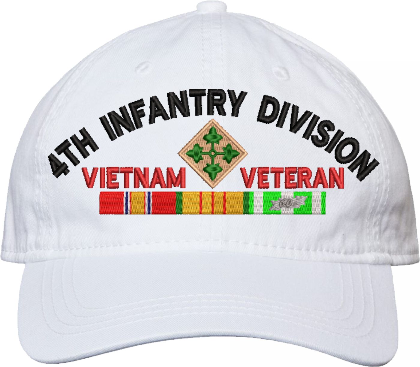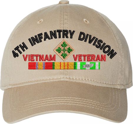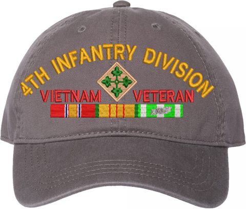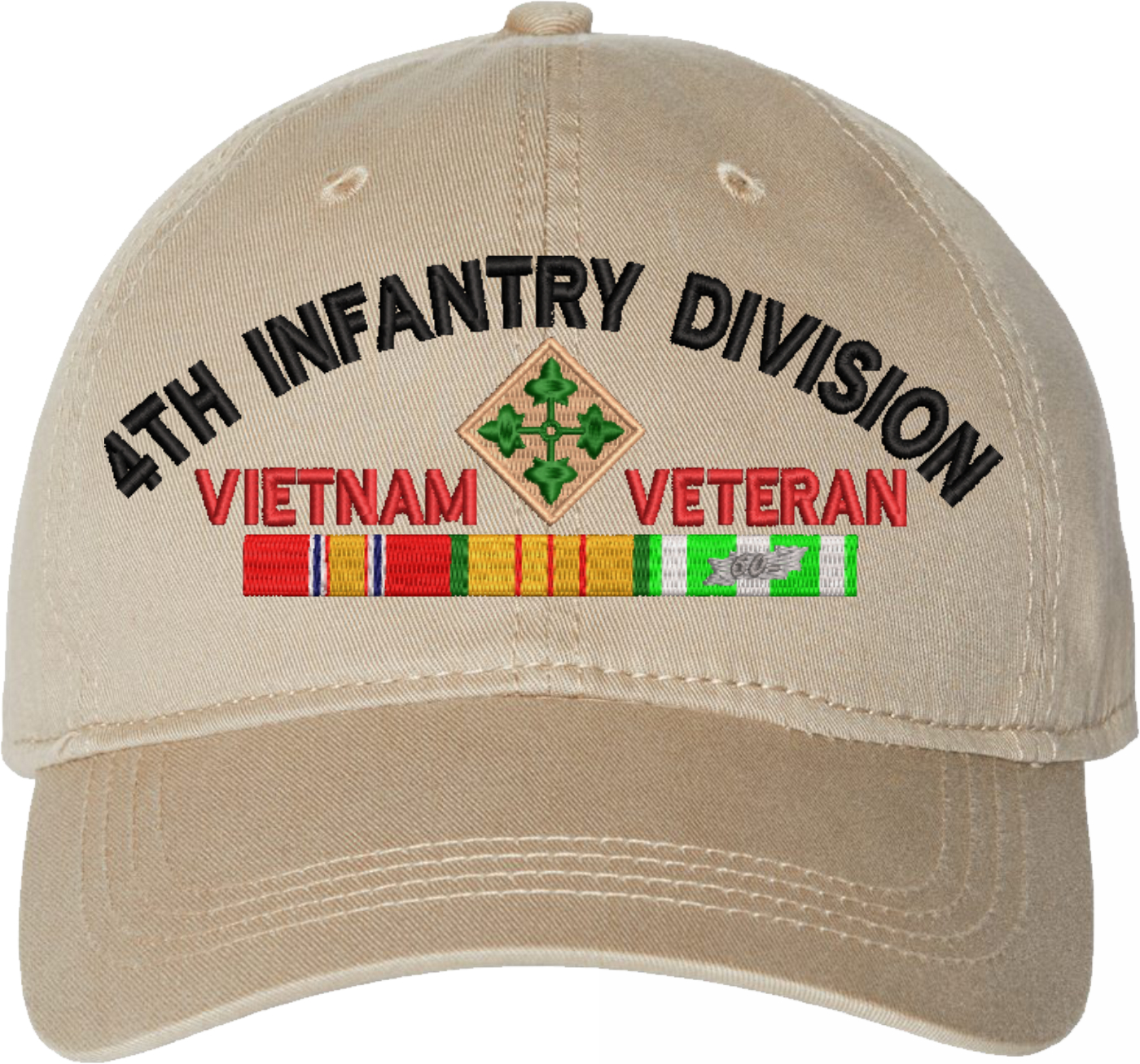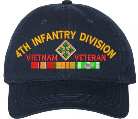 Show your Army pride with this 4th Infantry Division Vietnam Veteran with Ribbons Unstructured Dad Cap from MilitaryBest. Crafted from 100% washed chino twill cotton, this six-panel, low-profile cap offers a relaxed and comfortable fit. Featuring high-quality embroidery done in our Scottsboro, Alabama facility, this cap is designed with a pre-curved visor and an adjustable tri-glide buckle closure for a perfect fit. Whether for everyday wear or as a meaningful gift, this cap is a great way to honor your own or a loved one's service.For caps ordered with custom embroidered personalized text please allow an additional 3 to 5 days production time. All custom back text will be embroidered in ALL CAPITAL LETTERS. Caps with back text or eggs are non-returnable unless there is a material defect in the cap.