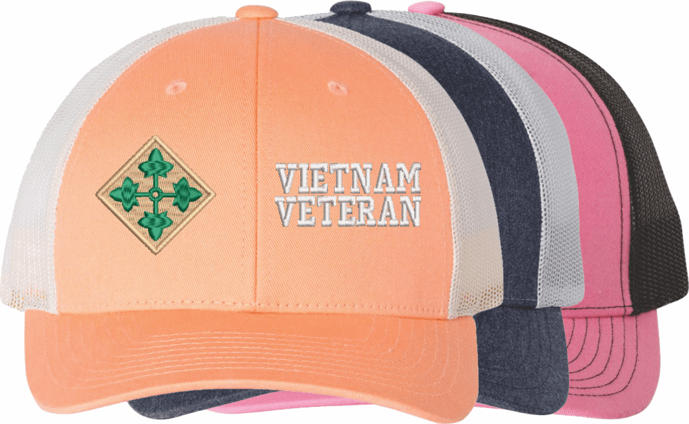 MilitaryBest is proud to offer this Mesh Back U.S. Army 4th Infantry Division Vietnam Veteran Women's Split-Cap. The design is embroidered onto a 6x panel mid/low profile mesh back cap and is crisp, clean, and sure to be loved by all! As with all MilitaryBest caps and apparel your satisfaction is guaranteed!Caps ordered with embroidered back text requires an additional 1 to 2 days of production time. All personalized caps will be embroidered in ALL CAPITAL LETTERS. Caps personalized with back text are not returnable unless there is a material defect in the cap.