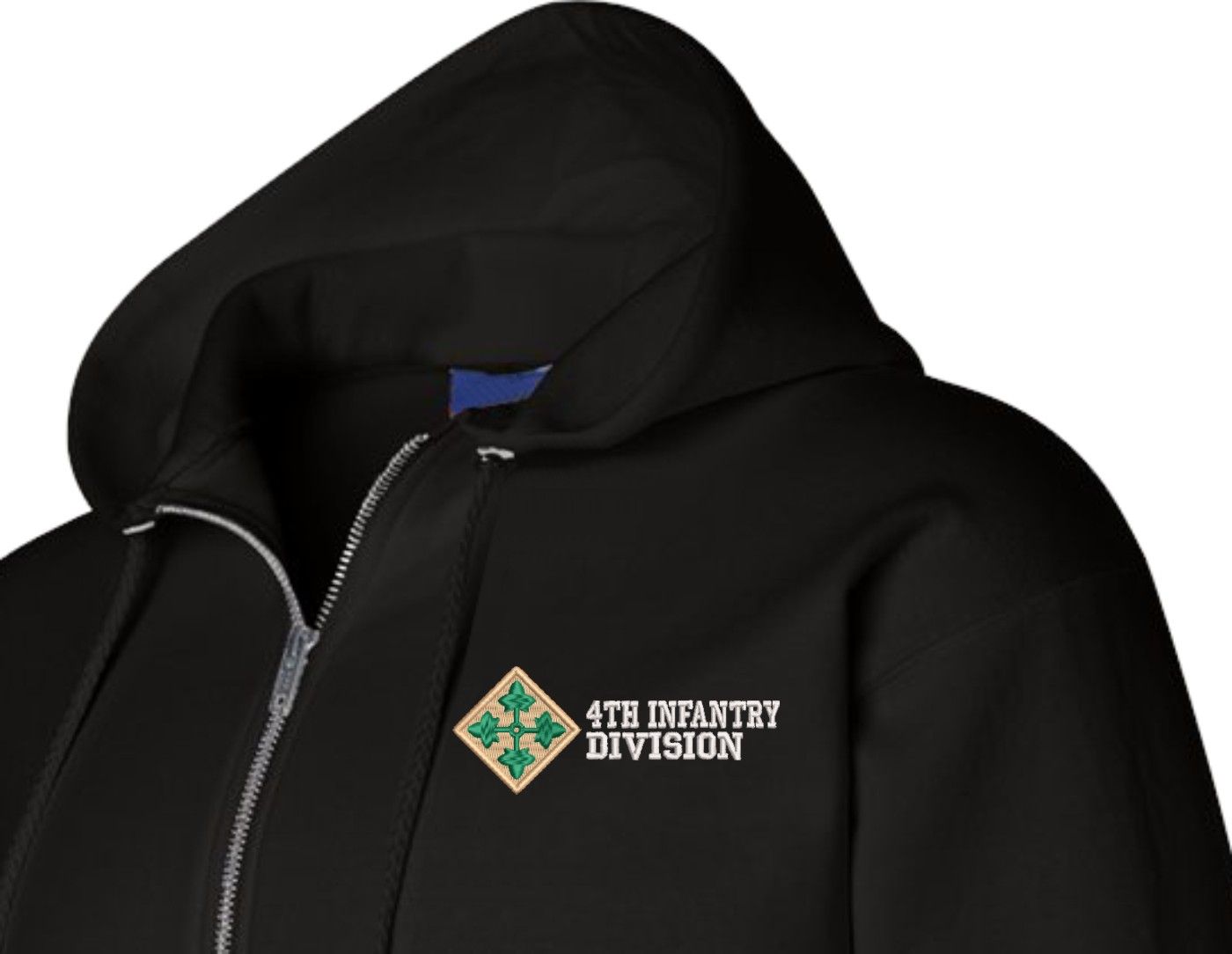 MilitaryBest is proud to offer this quality 4th Infantry Division Zippered Hoodie. Each U.S. Army Zippered Hoodie is direct embroidered onto either a Champion or Gildan brand Zippered Hoodie using a 9.5 oz 50/50 Cotton Poly blend material. These Military Zippered Hoodies are proudly embroidered at our facilities in Scottsboro, AL.