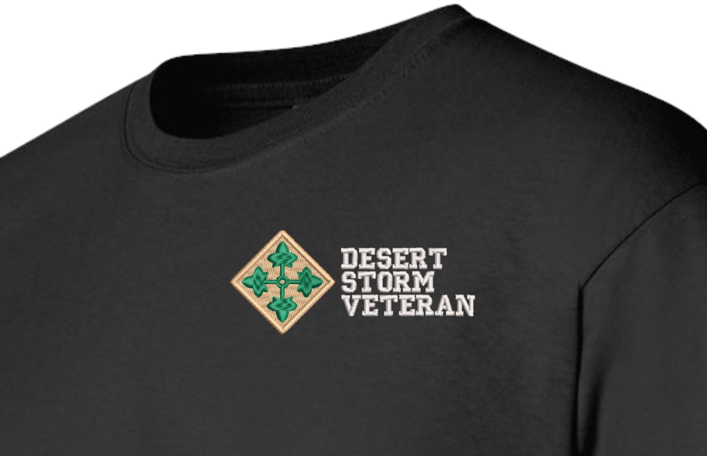 Note: Some of the Color Options pictured may not be available. Available Color Options are listed on the drop down menu above.MilitaryBest is proud to offer this quality 4th Infantry Division Desert Storm Veteran T Shirt. This Gildan brand short sleeve t-shirt is made using a 6 oz pre-shrunk 100% cotton material. These quality Military T Shirts are proudly embroidered at our facilities in Scottsboro, AL. Support the Army MWR program by purchasing only from Licensed Vendors.