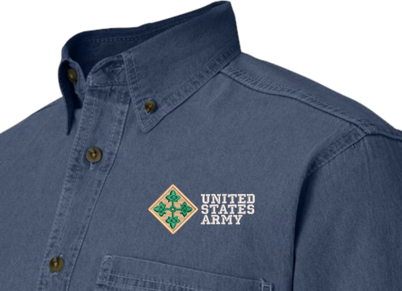Note: Some of the Color Options pictured may not be available. Available Color Options are listed on the drop down menu above.MilitaryBest is proud to offer this quality 4th Infantry Division United States Army Denim Shirt. This long sleeve button down denim shirt is made using a 100% cotton denim material. These quality Military Denim Shirts are proudly embroidered at our facilities in Scottsboro, AL. Support the Army MWR program by purchasing only from Licensed Vendors.
