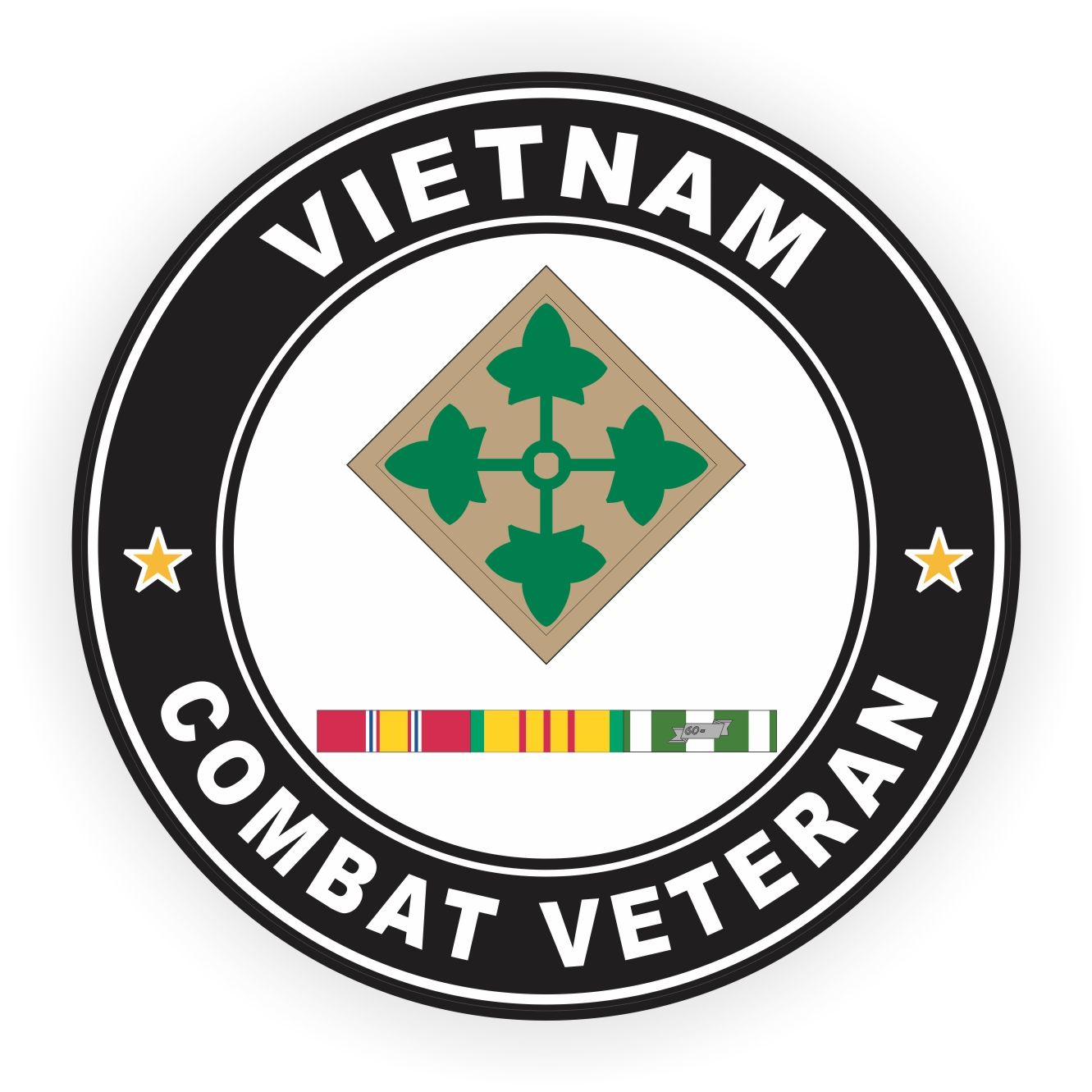This Vinyl 4th Infantry Division Vietnam Combat Veteran with Ribbons sticker is a Militarybest.com exclusive. Our combat veteran decal is made at our facilities in Scottsboro, Alabama. This sticker measures on its longest side and it is designed for outside application. MilitaryBest Decals are intended for Window/Glass surfaces. Many of our customers have used them for a large variety of purposes, however, we cannot guarantee their effectiveness on other surfaces.