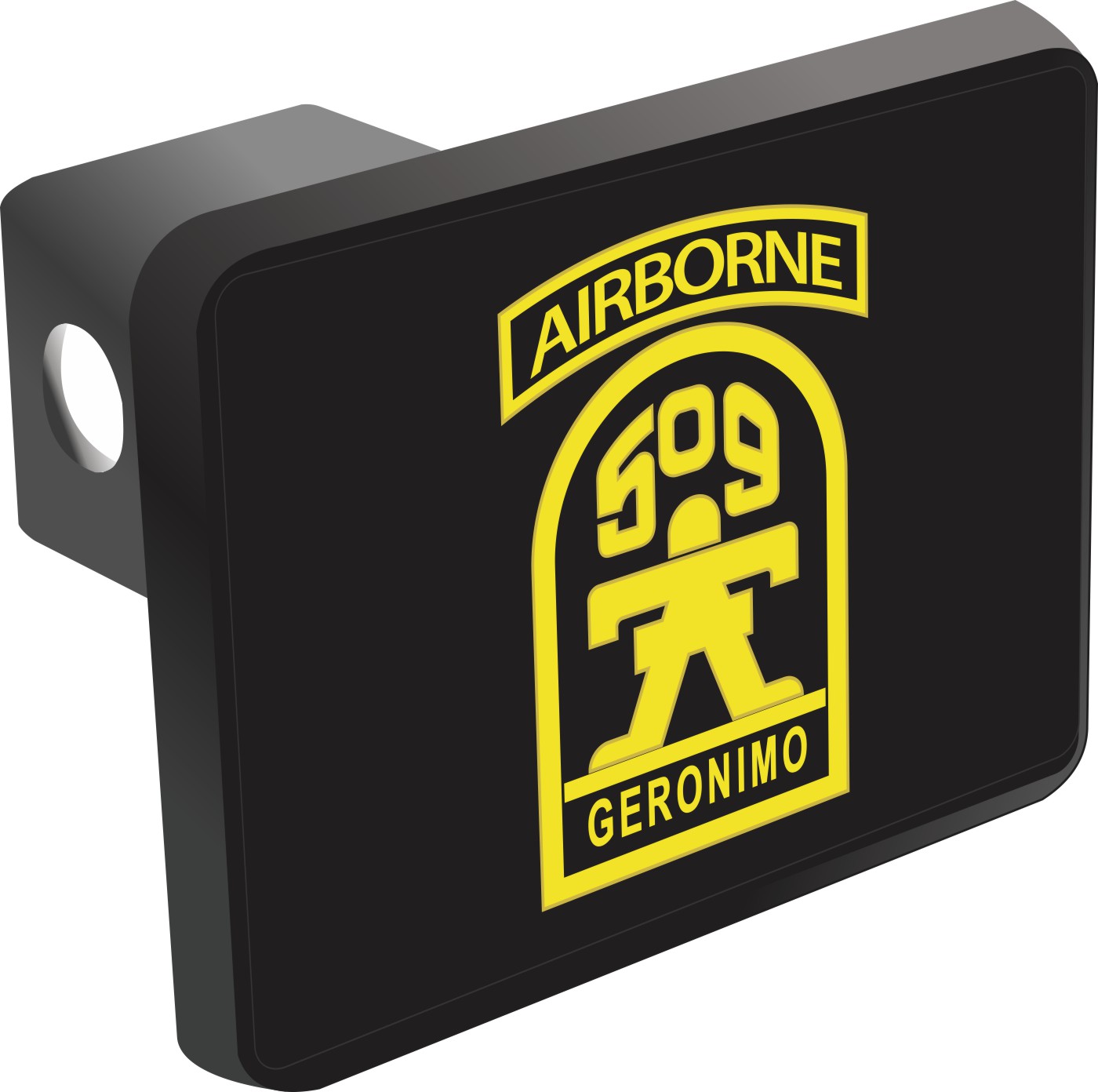 This 509th Geronimo Airborne Hitch Cover is proudly Made in the USA. Each Hitch Cover's face plate measures 4.7" x 3.4" and is applied on a black heavy duty injection molded plastic 2" hitch cover; link pin not included. The face plate of the hitch cover is sublimation printed to provide a beautiful glossy finish sure to catch the eye. This hitch cover would make a wonderful addition to your truck or other vehicle.A percentage of the sale of each MilitaryBest item is forwarded to the licensing departments of each respective branch of service in support of the MWR (Morale, Welfare, & Recreation) program. These payments are made by either ALL4U LLC or the wholesaler from where the item originated. Our team thanks you for your service and your support of these programs.