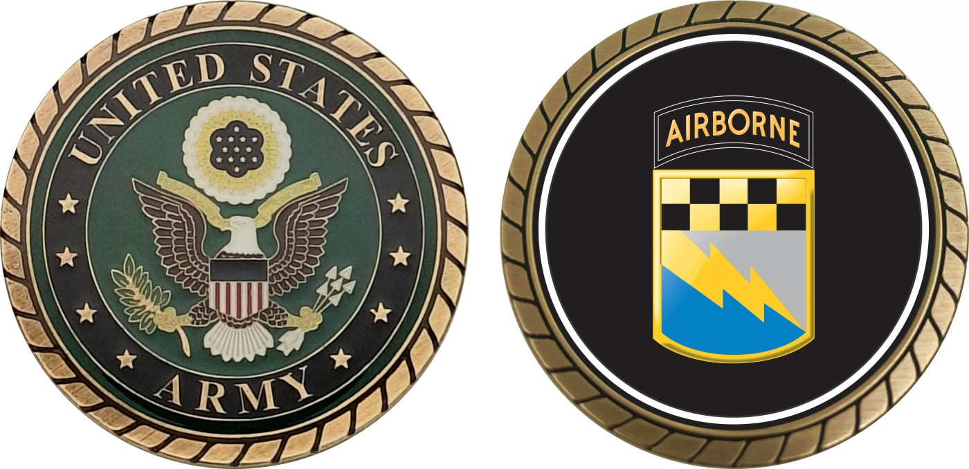 This 1 3/4” 525th Military Intelligence Brigade Airborne Challenge Coin is proudly offered by Militarybest. This Officially Licensed Army coin has beautiful enamel finish on one side and an organized crisp clean design on the opposite side.