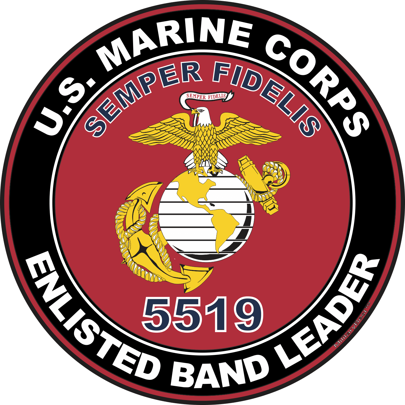 MilitaryBest is proud to offer this U.S.M.C. MOS 5519 Enlisted Band Leader Decal. This U.S. Marine Corps MOS Decal is a great way to show your Marine Pride. All MilitaryBest Marine Corps stickers are printed using high-quality vinyl and U.V. resistant ink. Each is then cured, laminated and die cut for a beautiful crisp, clean and professional look. This U.S.M.C. MOS 5519 Enlisted Band Leader Decal, as well as, any other MilitaryBest.com decal is proudly Made in the USA at our facilities in Scottsboro, AL. Select desired quantity and size from the menu above.Features: