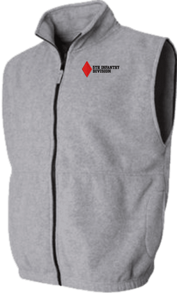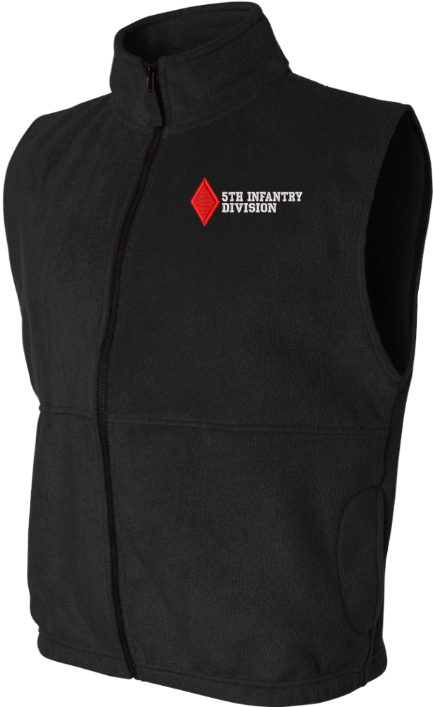Due to supply chain disruptions, some colors and sizes may not be available in the same Brand, in these cases a brand of comparable quality will be used. Feel free to call in advance of your order, with questions you may have.MilitaryBest is proud to offer this quality 5th Infantry Division Full-Zip Fleece Vest. Our U.S. Army Full Zip Fleece Vest features a convertible collar with dyed-to-match zipper pull and oversized nylon reinforced slash pockets. These Military Vests are proudly embroidered at our facilities in Scottsboro, AL.