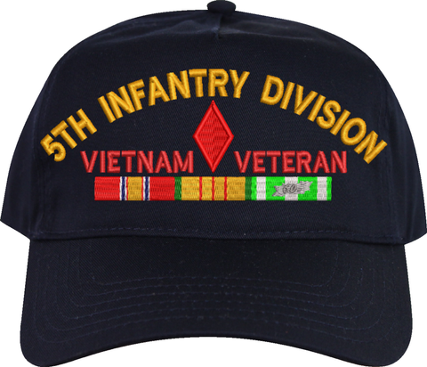 MilitaryBest is proud to offer this 5th Infantry Division Vietnam Veteran Embroidered Cap with Ribbons. This cap is available in a 5 panel high profile or 6 panel low profile styling. All our caps are made from top quality materials. This cap would make a wonderful addition to your collection or a great gift! All custom embroidery is done at our facility in Scottsboro, AL.