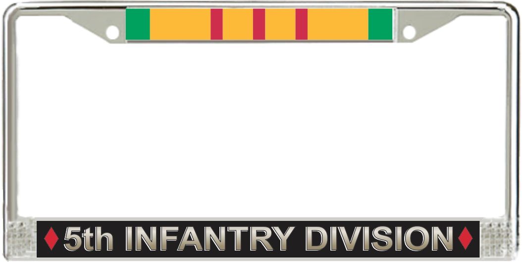 5th Infantry Division Vietnam Veteran Service Ribbon License Plate FrameThis 5th Infantry Division Vietnam Veteran License Plate Frame is made from the highest quality finished metal alloy. Each one is designed to provide years of use. Each is designed and produced in our facility in Scottsboro, Alabama.