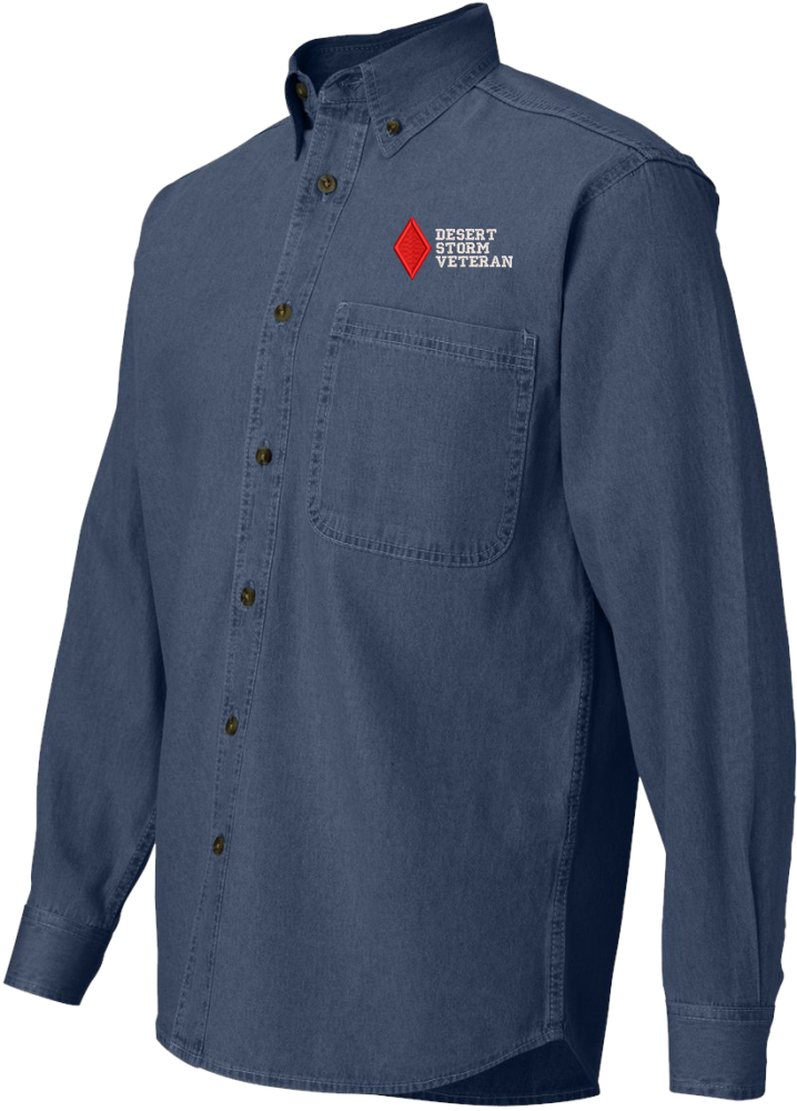 Note: Some of the Color Options pictured may not be available. Available Color Options are listed on the drop down menu above.MilitaryBest is proud to offer this quality 5th Infantry Division Desert Storm Veteran Denim Shirt. This long sleeve button down denim shirt is made using a 100% cotton denim material. These quality Military Denim Shirts are proudly embroidered at our facilities in Scottsboro, AL. Support the Army MWR program by purchasing only from Licensed Vendors.