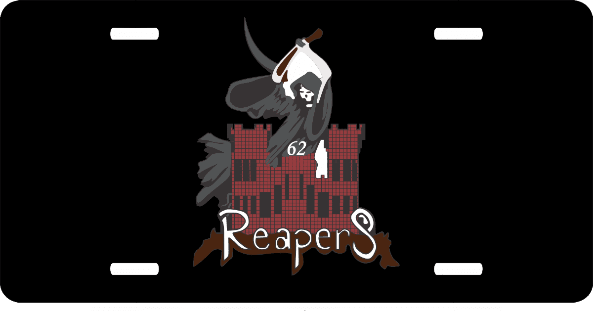 This 62nd Engineers Company Reapers s s License Plate is made from heavy gauge aluminum and has a baked enamel finish to last for many years of use. Each plate measures 5 15/16" x 11 15/16". This license plate would make a wonderful addition to your collection or a great gift.