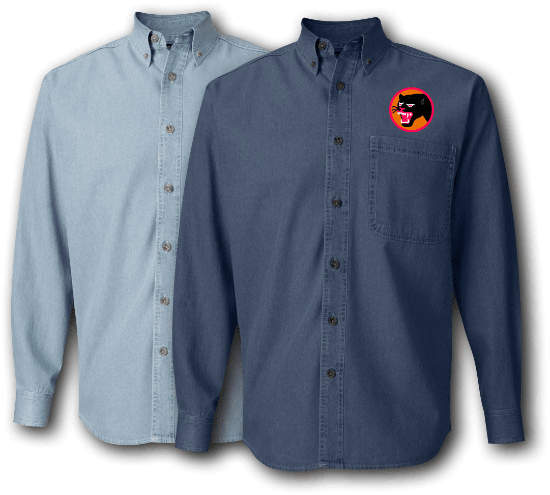 Each 66th Infantry Division Denim shirt is made of 6.5 oz., 100% cotton denim, Button-down collar with woodtone buttons, Three woodtone buttons on adjustable placket cuff, Double-needle STITCHING throughout, felled seams, Left chest pocket, Two-ply back yoke and locker loop, and a seamless body with set-in sleeves. Enjoy your shirt!