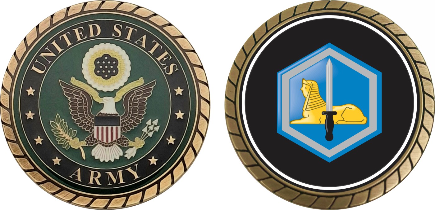 This 1 3/4” 66th Military Intelligence Brigade Patch Challenge Coin is proudly offered by Militarybest. This Officially Licensed Army coin has beautiful enamel finish on one side and an organized crisp clean design on the opposite side.