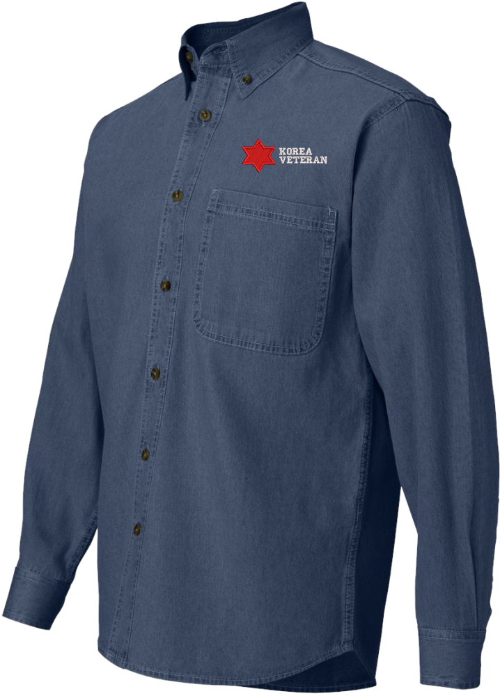 Note: Some of the Color Options pictured may not be available. Available Color Options are listed on the drop down menu above.MilitaryBest is proud to offer this quality 6th Infantry Division Korea Veteran Denim Shirt. This long sleeve button down denim shirt is made using a 100% cotton denim material. These quality Military Denim Shirts are proudly embroidered at our facilities in Scottsboro, AL. Support the Army MWR program by purchasing only from Licensed Vendors.