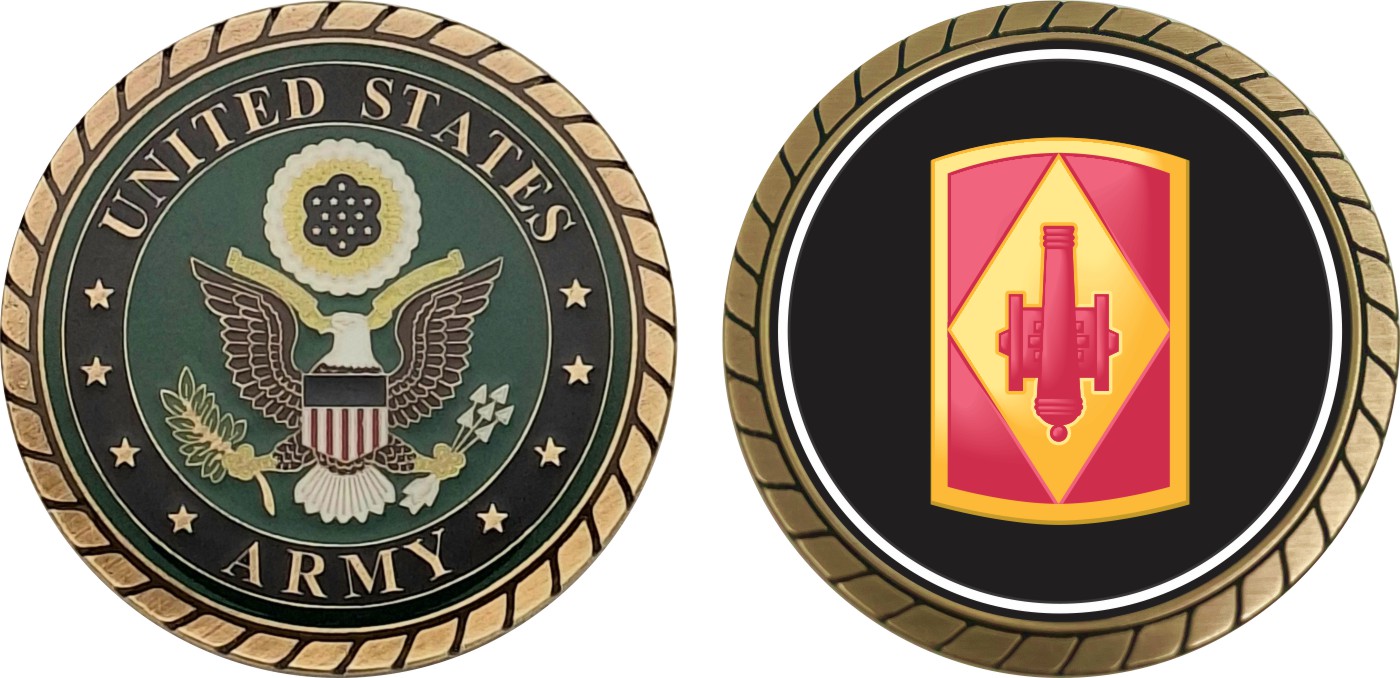 This 1 3/4” 75th Field Artillery Brigade Patch Challenge Coin is proudly offered by Militarybest. This Officially Licensed Army coin has beautiful enamel finish on one side and an organized crisp clean design on the opposite side.