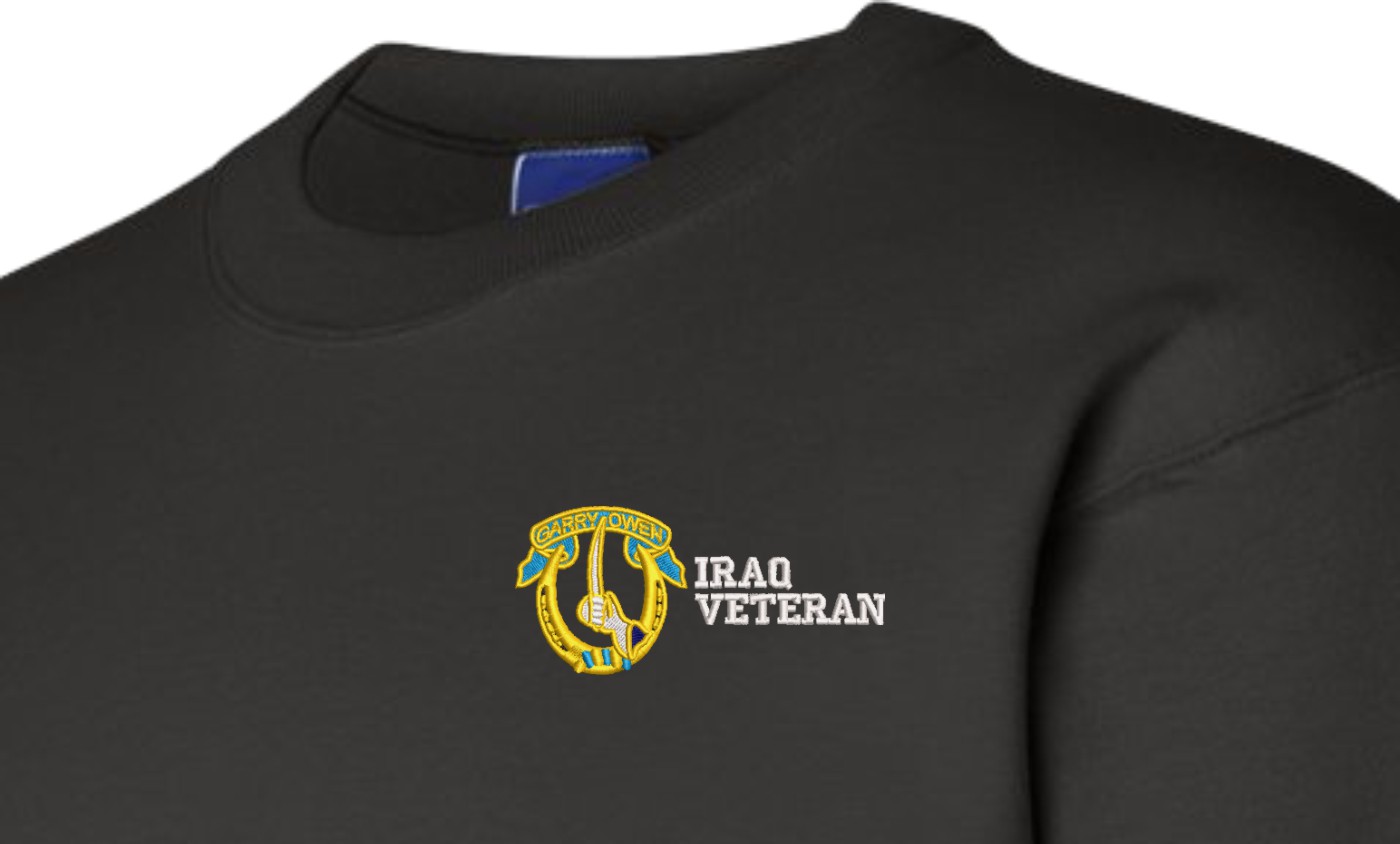 MilitaryBest is proud to offer this quality 7th Cavalry Division Iraq Veteran Sweatshirt. Each U.S. Army sweatshirt is direct embroidered onto either a Champion or Jerzees brand sweatshirt using a 9.5 oz 50/50 Cotton Poly blend material. These Military Sweatshirts are proudly embroidered at our facilities in Scottsboro, AL.
