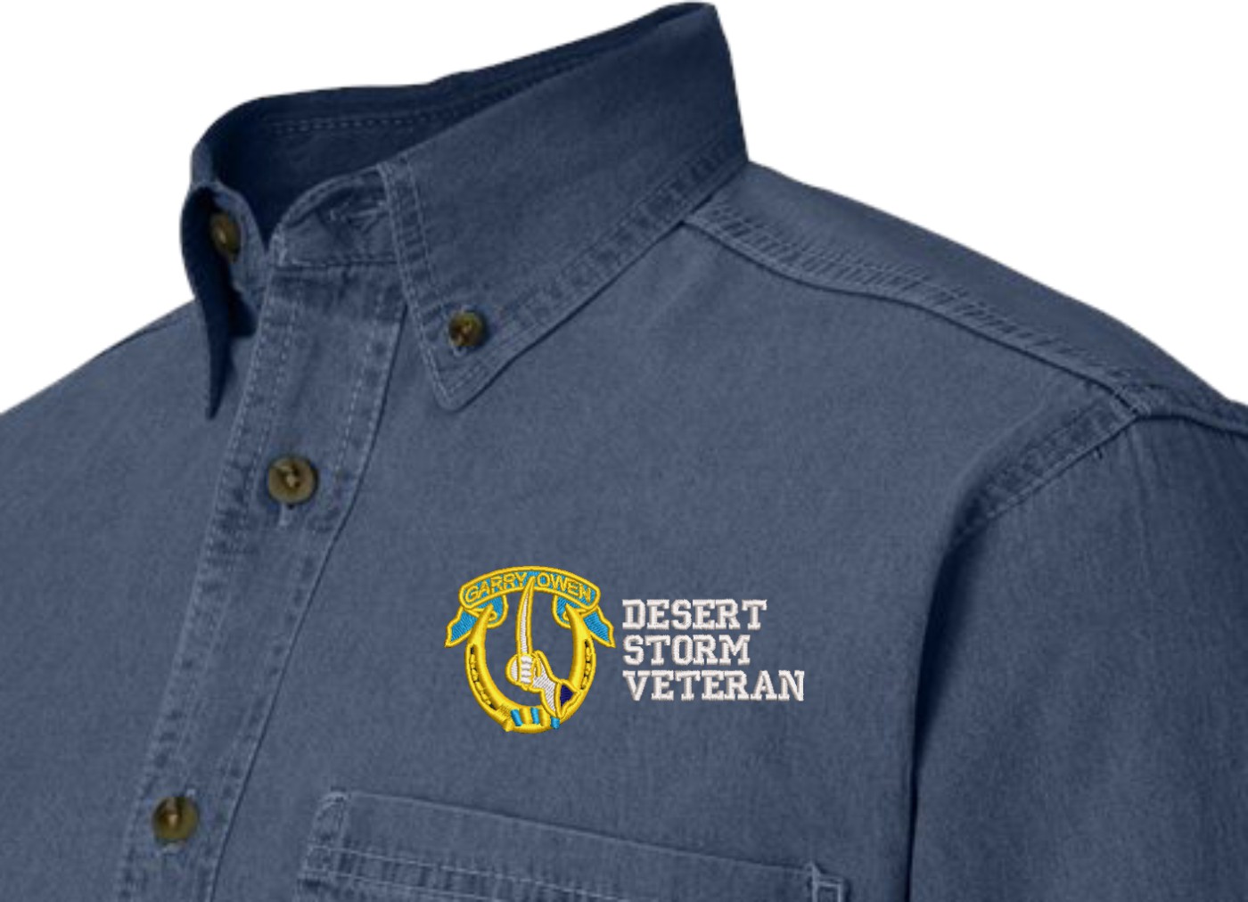 Note: Some of the Color Options pictured may not be available. Available Color Options are listed on the drop down menu above.MilitaryBest is proud to offer this quality 7th Cavalry Regiment Desert Storm Veteran Denim Shirt. This long sleeve button down denim shirt is made using a 100% cotton denim material. These quality Military Denim Shirts are proudly embroidered at our facilities in Scottsboro, AL. Support the Army MWR program by purchasing only from Licensed Vendors.