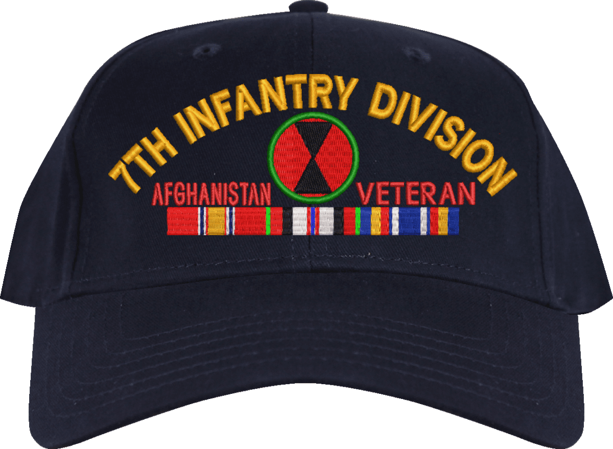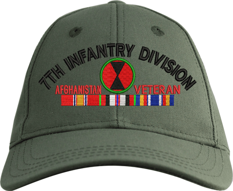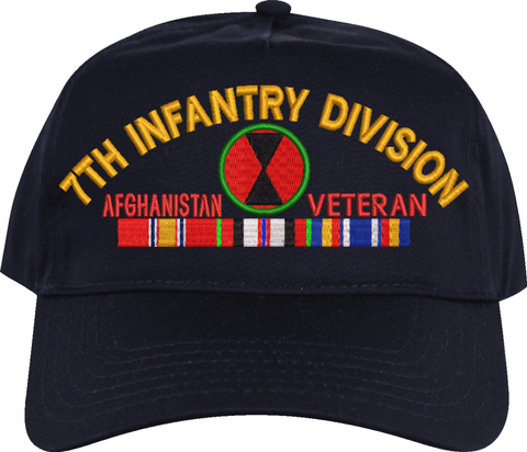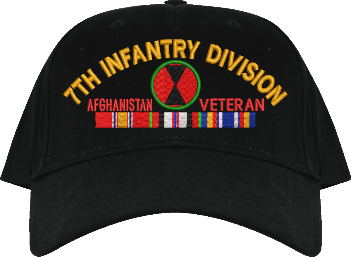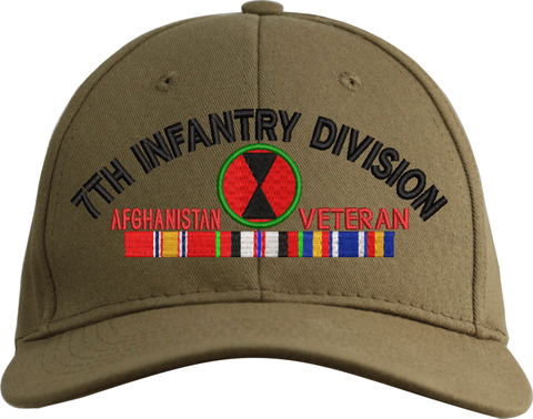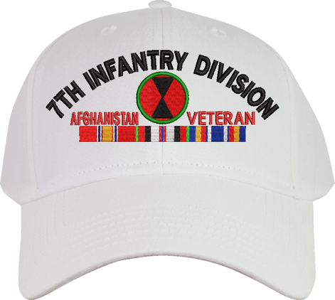 MilitaryBest is proud to offer this 7th Infantry Division Afghanistan Veteran Embroidered Cap with Ribbons. This cap is available in a 5 panel high profile or 6 panel low profile styling. All our caps are made from top quality materials. This cap would make a wonderful addition to your collection or a great gift! All custom embroidery is done at our facility in Scottsboro, AL.