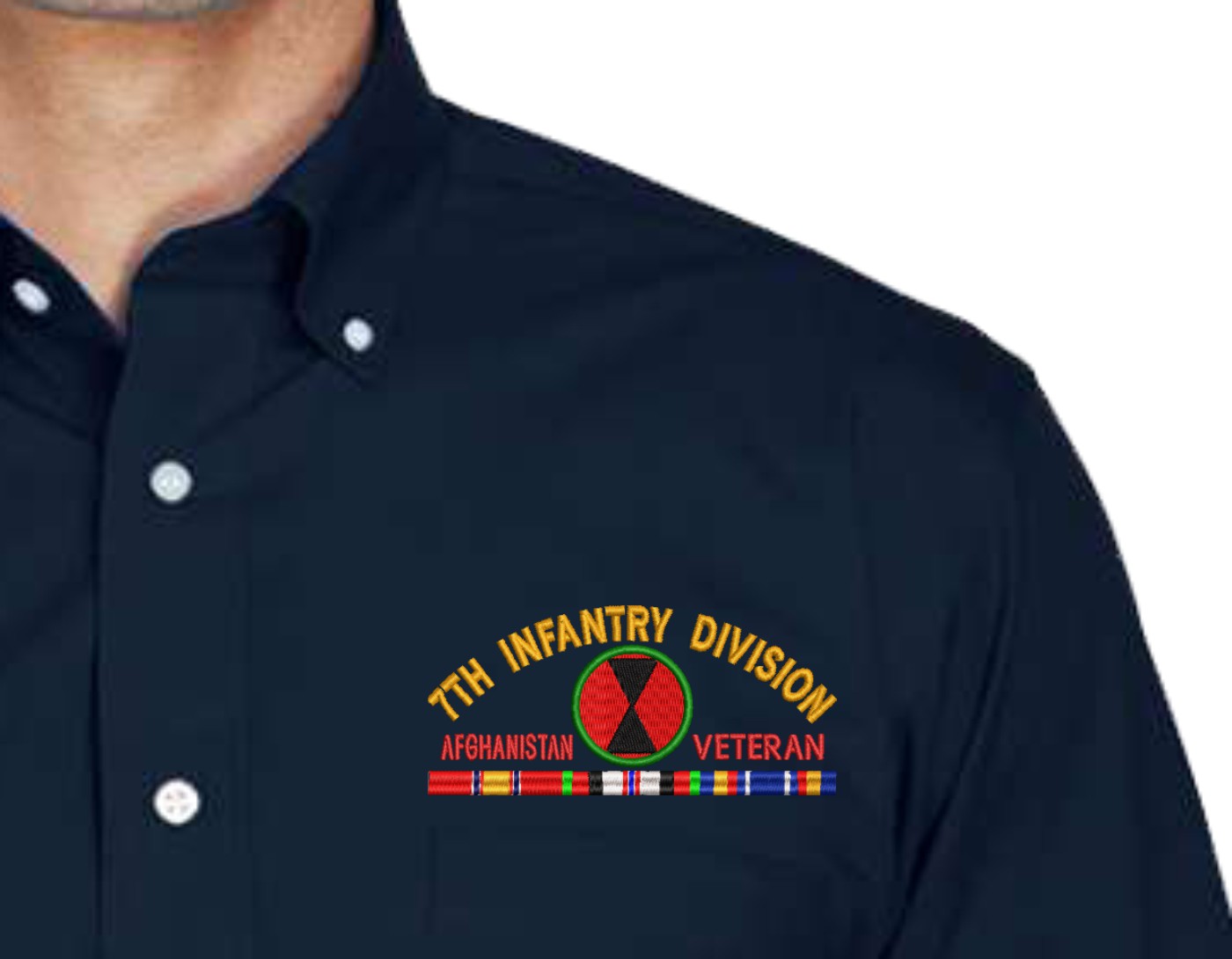 MilitaryBest has expanded its line of apparel with this 7th Infantry Division Afghanistan Veteran with Ribbons Embroidered Dress Shirt. This long sleeve button down dress shirt is made using a stain-release, wrinkle-free, 55% cotton/45% polyester material. The pocket over the left chest measures 4 3/4" across. Featuring a 7th Infantry Division Afghanistan Veteran with Ribbons design above the pocket, this shirt is embroidered to order at our facilities in Scottsboro, AL..- 55% cotton/45% polyester