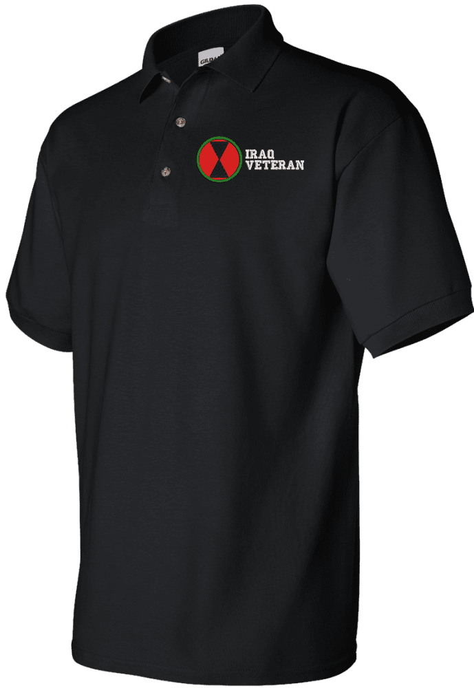 Note: Some of the Color Options pictured may not be available. Available Color Options are listed on the drop down menu above.MilitaryBest is proud to offer this quality 7th Infantry Division Iraq Veteran Polo. Each Polo is available in either 100% Ringspun cotton pique or a 50/50 cotton/polyester blend. These quality Military Polos are proudly embroidered at our facilities in Scottsboro, AL. Support the Army MWR program by purchasing only from Licensed Vendors.