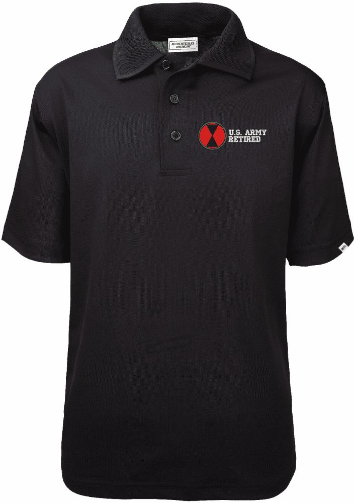 MilitaryBest proudly offers a top-quality 7th Infantry Division Retired Authentically American Mens Moisture Wicking Polo made in the USA by Authentically American whom we have proudly partnered with.- Proudly Made and Embroidered in the USA.