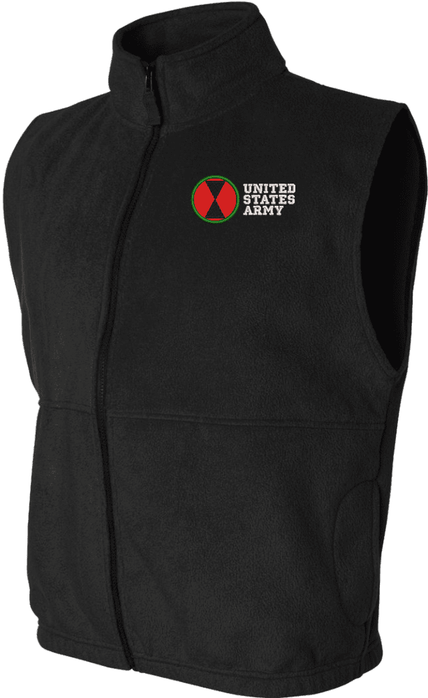 Due to supply chain disruptions, some colors and sizes may not be available in the same Brand, in these cases a brand of comparable quality will be used. Feel free to call in advance of your order, with questions you may have.MilitaryBest is proud to offer this quality 7th Infantry Division United States Army Full-Zip Fleece Vest. Our U.S. Army Full Zip Fleece Vest features a convertible collar with dyed-to-match zipper pull and oversized nylon reinforced slash pockets. These Military Vests are proudly embroidered at our facilities in Scottsboro, AL.