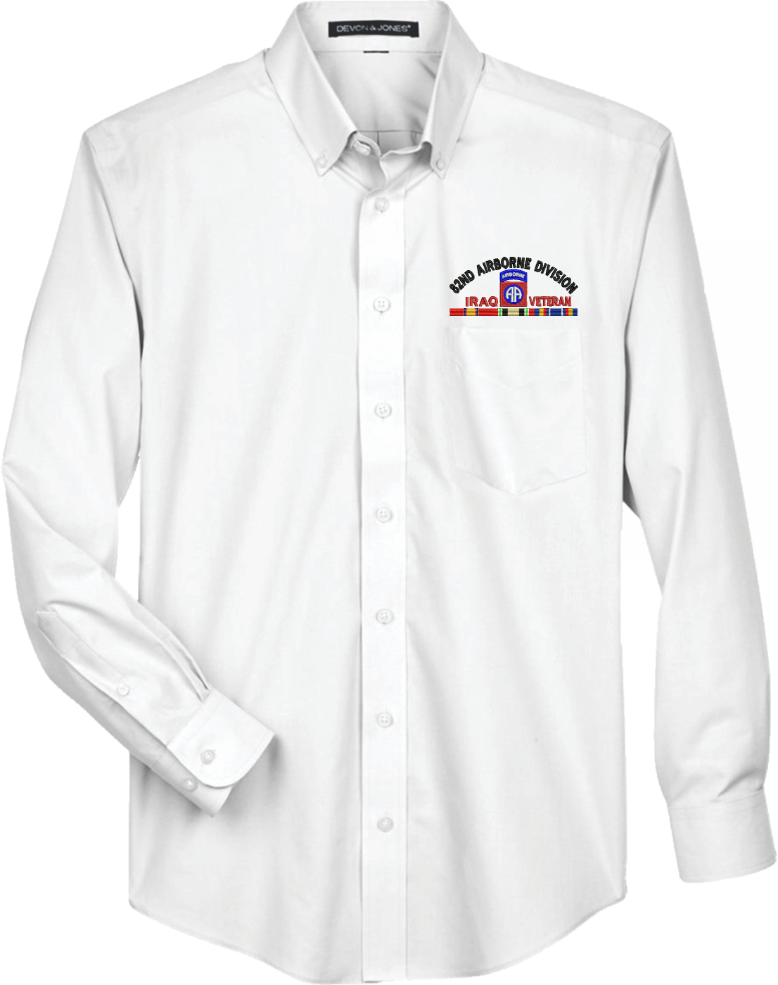 MilitaryBest has expanded its line of apparel with this 82nd Airborne Division Iraq Veteran with Ribbons Embroidered Dress Shirt. This long sleeve button down dress shirt is made using a stain-release, wrinkle-free, 55% cotton/45% polyester material. The pocket over the left chest measures 4 3/4" across. Featuring a 82nd Airborne Division Iraq Veteran with Ribbons design above the pocket, this shirt is embroidered to order at our facilities in Scottsboro, AL..- 55% cotton/45% polyester