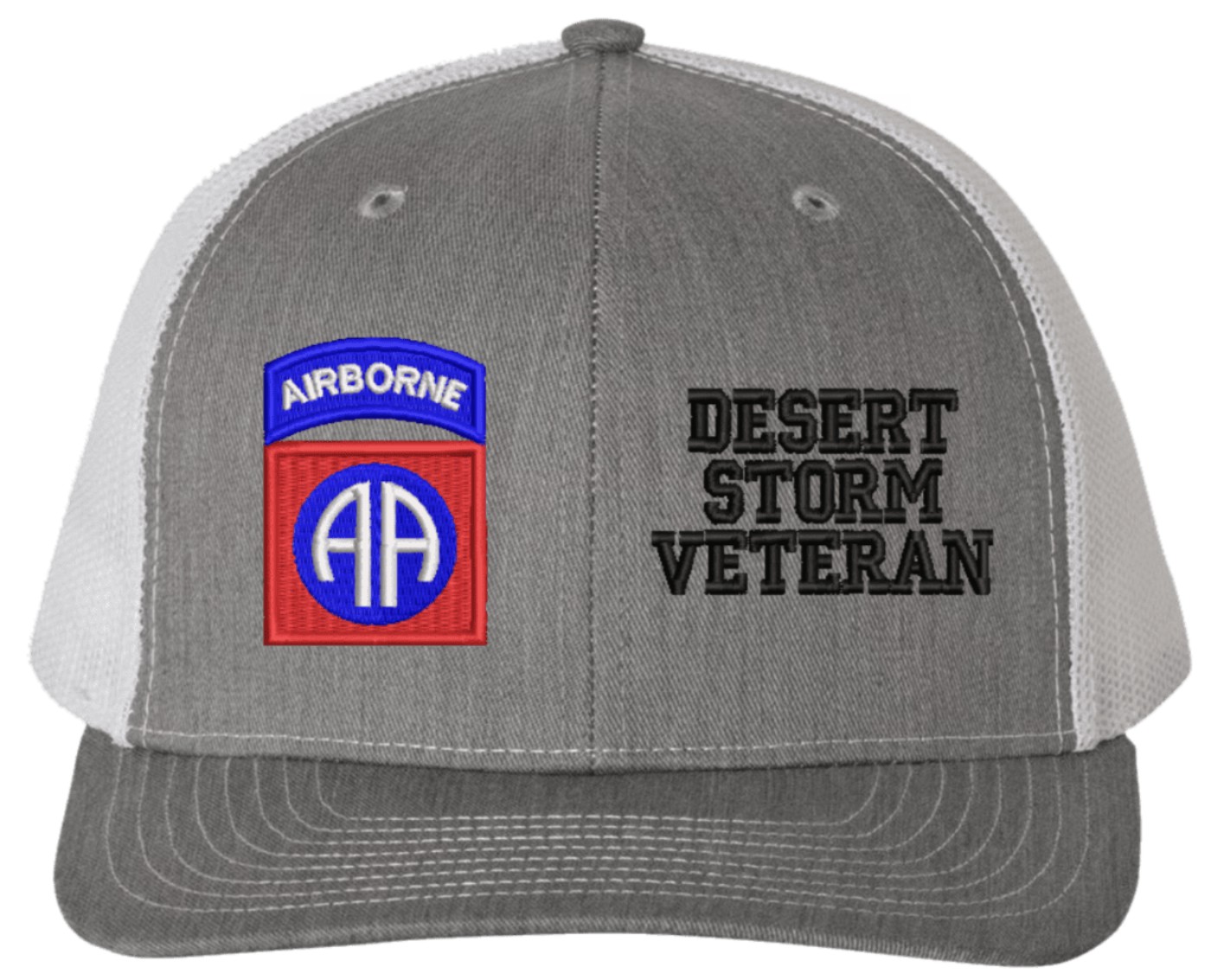 This 82nd Airborne Desert Storm Veteran Heather Grey Front/White Mesh-Back Cap is an overstock item and is only available for the value price while supplies last. Clearance Items are not eligible for Refunds or Returns,A percentage of the sale of each MilitaryBest item is forwarded to the licensing departments of each respective branch of service in support of the MWR (Morale, Welfare, & Recreation) program. These payments are made by either ALL4U LLC or the wholesaler from where the item originated. Our team thanks you for your service and your support of these programs.