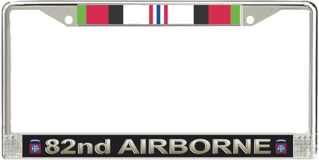 82nd Airborne Division Afghanistan Veteran Service Ribbon License Plate FrameThis U.S. Army 82nd Airborne Division Afghanistan Veteran License Plate Frame is made from the highest quality finished metal alloy. Each one is designed to provide years of use. Each is designed and produced in our facility in Scottsboro, Alabama.