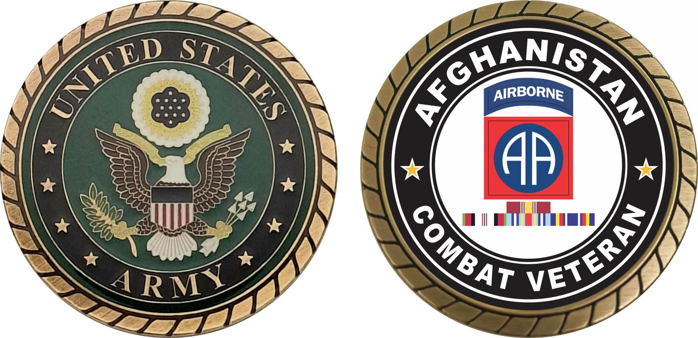 This 1 3/4” 82nd Airborne Division Afghanistan with GWOT Ribbons Combat Veteran Challenge Coin is proudly offered by MilitaryBest. This Officially Licensed Army coin has beautiful enamel finish on one side and an organized crisp clean 82nd Airborne Division Afghanistan with GWOT Ribbons Combat Veteran design on the opposite side.