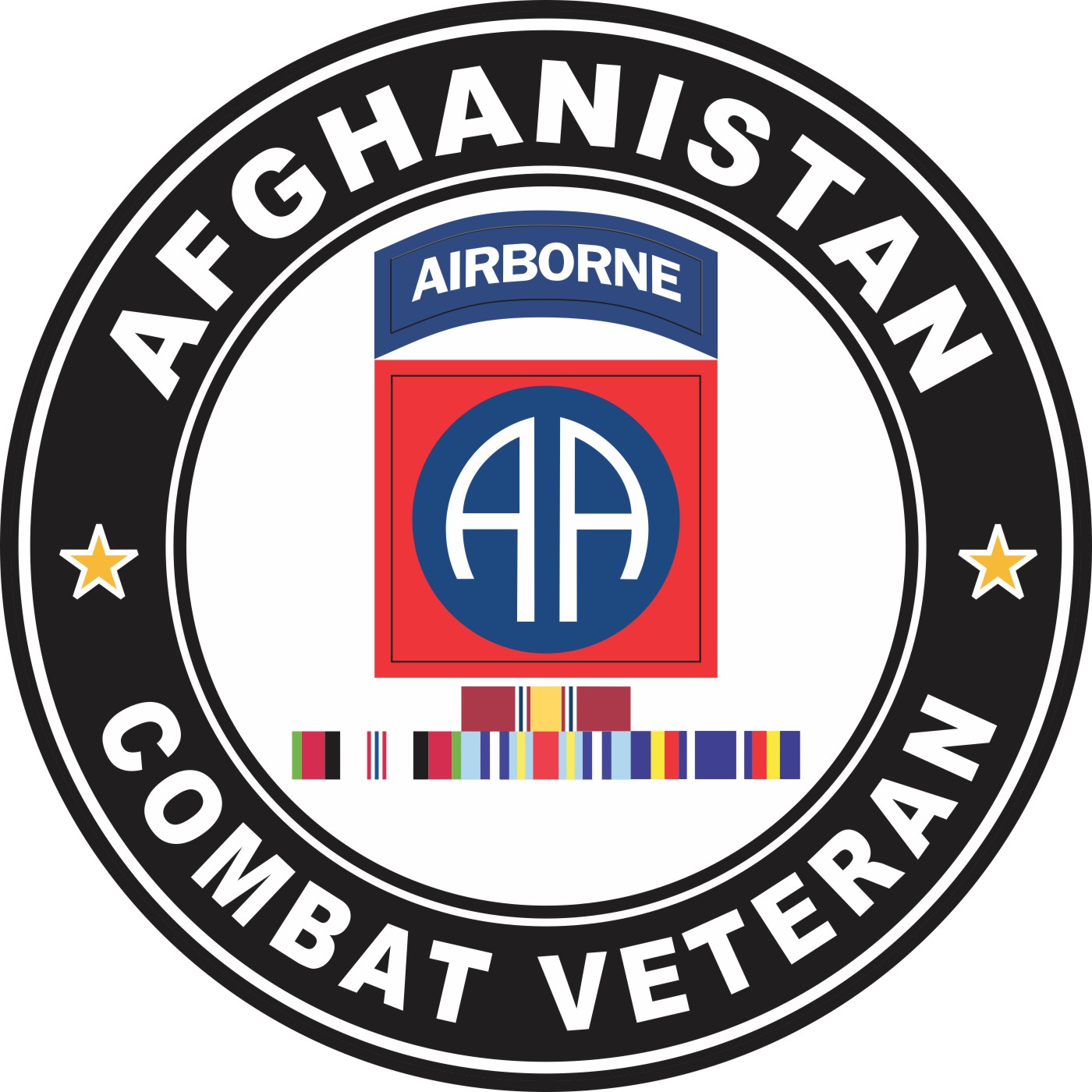 MilitaryBest is proud to offer this 82nd Airborne Division Afghanistan with GWOT Ribbons Combat Veteran Decal Made in the USA at our facilities in Scottsboro, Alabama using the finest ink and vinyl available. We have been producing high quality Military Decals for over 15 years and we guarantee the quality of each one. A portion of the sale of this decal goes to support the MWR (Morale, Welfare, & Recreation) programs of the different branches of the U.S. Military. For bulk pricing for custom and wholesale decals click here: Custom & Wholesale Decals!*While many of our customers use our decals on a variety of surfaces. Their intended purpose is for windshield applications