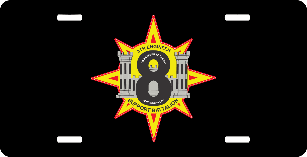 This 8th Engineer Support Battalion ESB 8 License Plate is made from heavy gauge aluminum and has a baked enamel finish to last for many years of use. Each plate measures 5 15/16" x 11 15/16". This license plate would make a wonderful addition to your collection or a great gift.