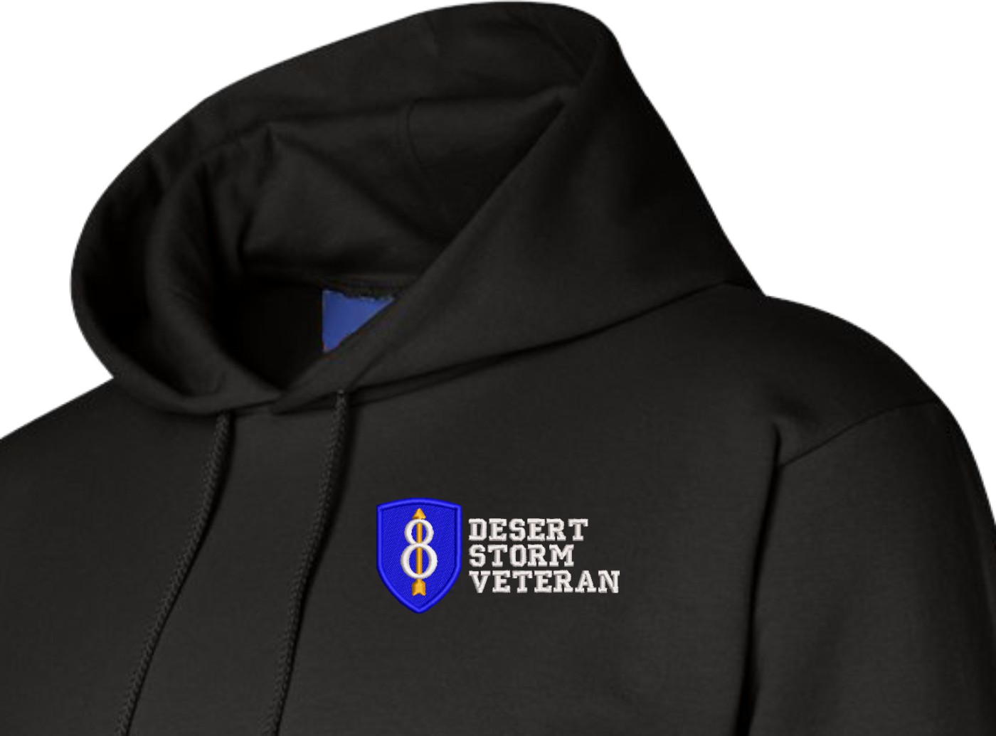 MilitaryBest is proud to offer this quality 8th Infantry Division Desert Storm Veteran Hoodie. Each U.S. Army Hoodie is direct embroidered onto either a Champion or Gildan brand Hoodie using a 9.5 oz 50/50 Cotton Poly blend material. These Military Hoodies are proudly embroidered at our facilities in Scottsboro, AL.