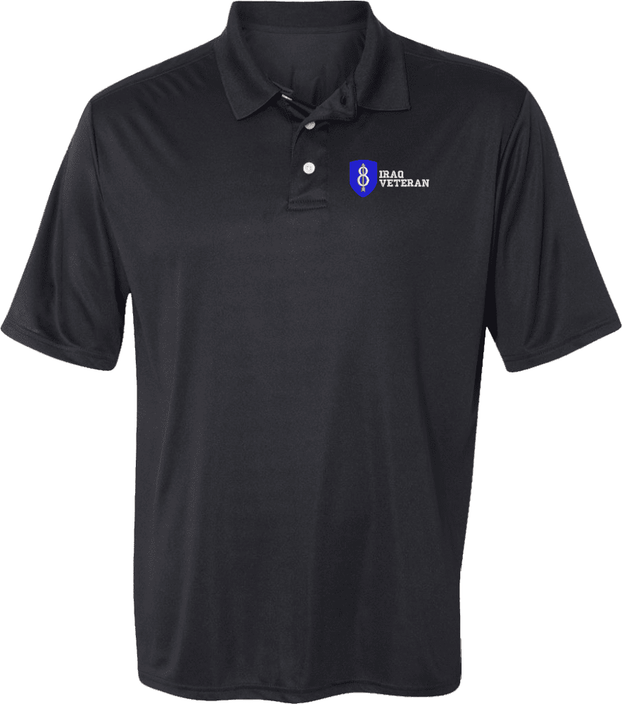 MilitaryBest is proud to offer this quality 8th Infantry Division Iraq Veteran Polo. This Polo is made using 50/50 cotton/polyester moisture wicking material.These quality Military Polos are proudly embroidered at our facilities in Scottsboro, AL. Support the Army MWR program by purchasing only from Licensed Vendors.