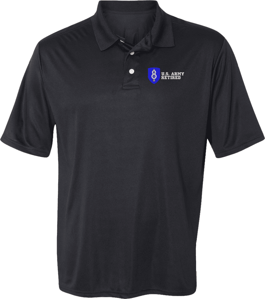 MilitaryBest is proud to offer this quality 8th Infantry Division Retired Polo. This Polo is made using 50/50 cotton/polyester moisture wicking material.These quality Military Polos are proudly embroidered at our facilities in Scottsboro, AL. Support the Army MWR program by purchasing only from Licensed Vendors.