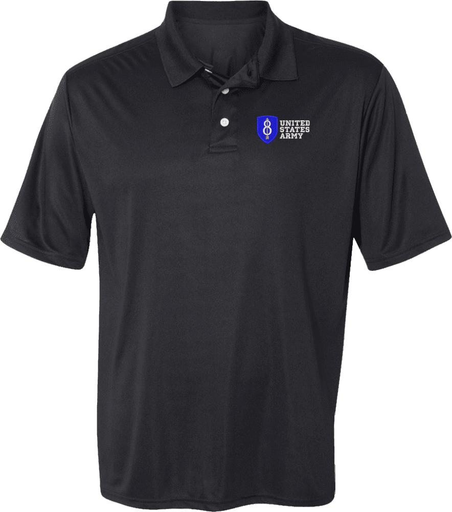 MilitaryBest is proud to offer this quality 8th Infantry Division United States Army Polo. This Polo is made using 50/50 cotton/polyester moisture wicking material.These quality Military Polos are proudly embroidered at our facilities in Scottsboro, AL. Support the Army MWR program by purchasing only from Licensed Vendors.
