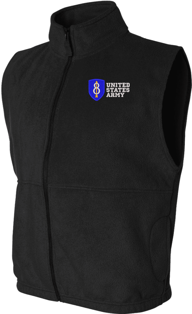 Due to supply chain disruptions, some colors and sizes may not be available in the same Brand, in these cases a brand of comparable quality will be used. Feel free to call in advance of your order, with questions you may have.MilitaryBest is proud to offer this quality 8th Infantry Division United States Army Full-Zip Fleece Vest. Our U.S. Army Full Zip Fleece Vest features a convertible collar with dyed-to-match zipper pull and oversized nylon reinforced slash pockets. These Military Vests are proudly embroidered at our facilities in Scottsboro, AL.