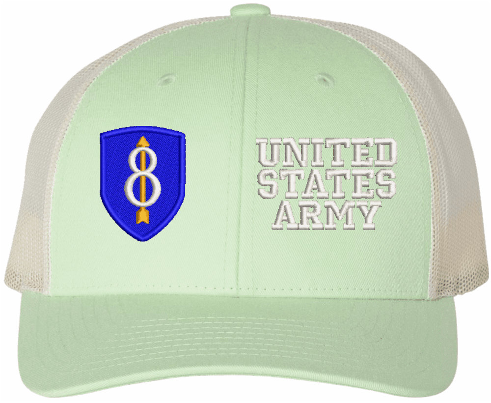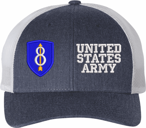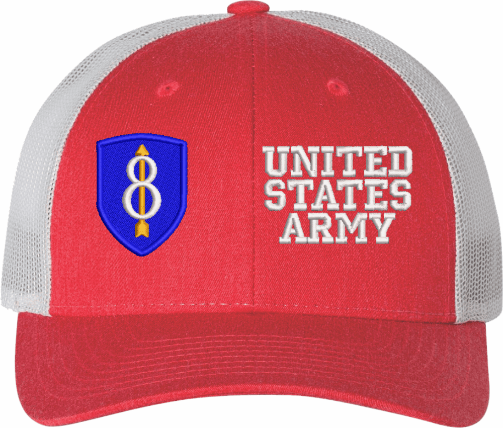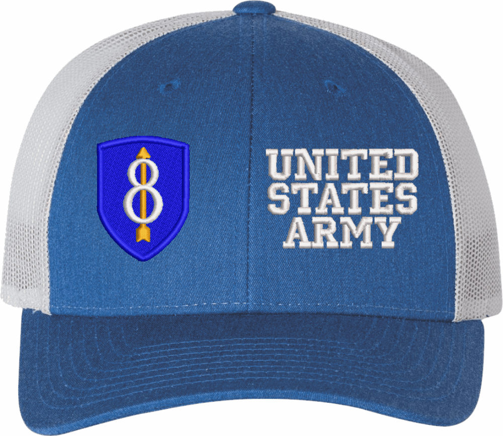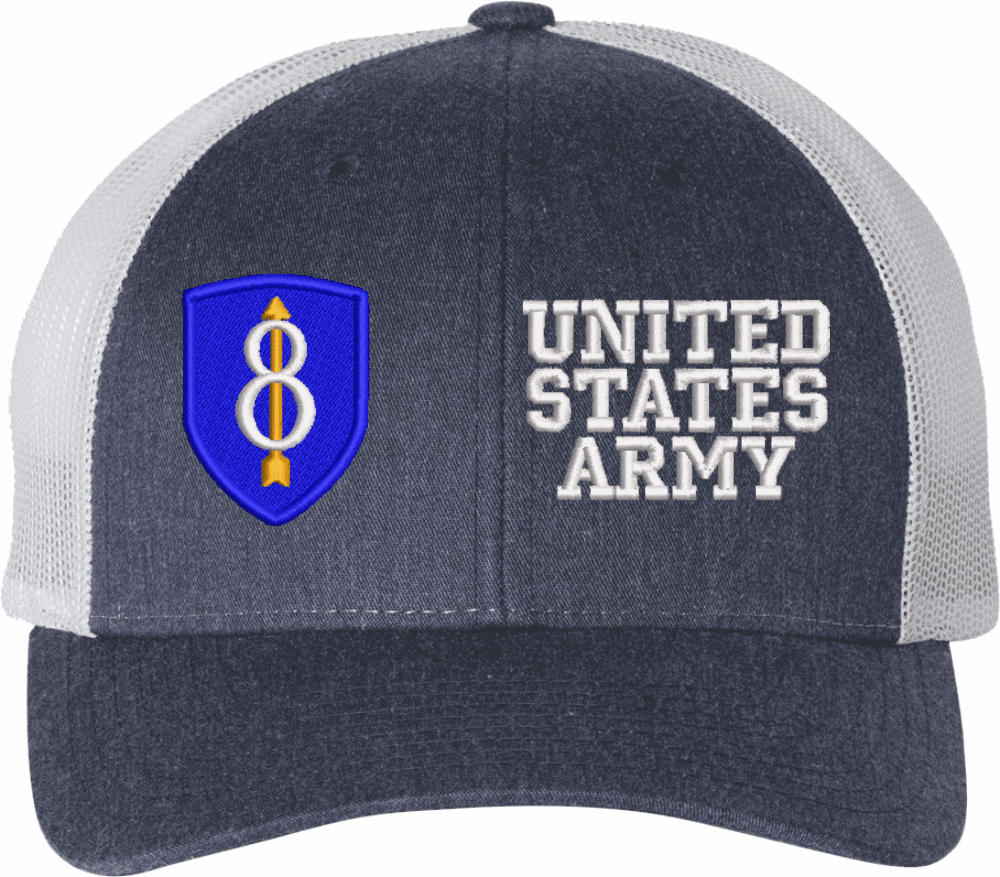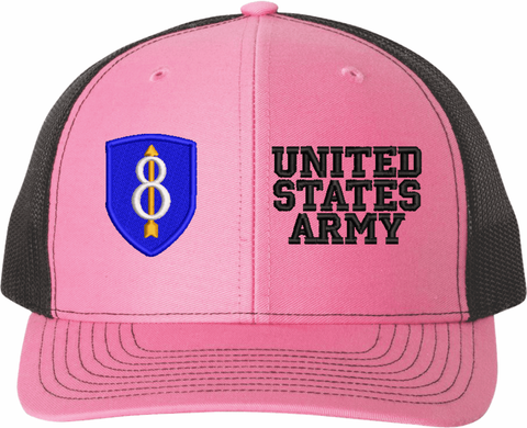 MilitaryBest is proud to offer this Mesh Back U.S. Army 8th Infantry Division United States Army Women's Split-Cap. The design is embroidered onto a 6x panel mid/low profile mesh back cap and is crisp, clean, and sure to be loved by all! As with all MilitaryBest caps and apparel your satisfaction is guaranteed!Caps ordered with embroidered back text requires an additional 1 to 2 days of production time. All personalized caps will be embroidered in ALL CAPITAL LETTERS. Caps personalized with back text are not returnable unless there is a material defect in the cap.
